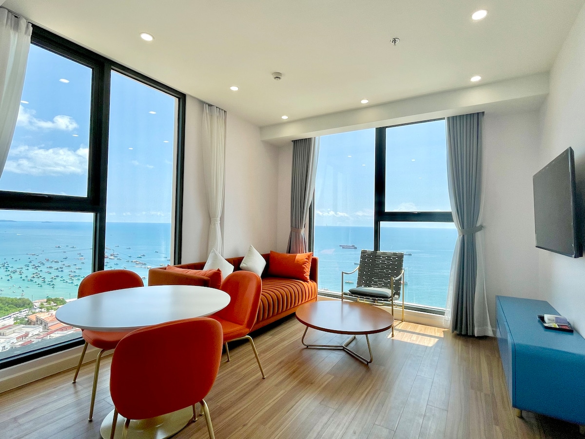 Nyd et fuldt ophold i Beachfront Condo: - Hyggeligt rum, stue og soveværelse med direkte havudsigt, solnedgang, fyrværkeri - Gratis: Fitnesscenter, infinity-pool på tagterrassen, børneklub - Fuldt møbler: Klimaanlæg, køleskab, mikrobølgeovn, vaskemaskine, køkkenredskaber,... 1 km radius: SJOVT nattemarked - FEST Bazaar, Minisupermarked, Restauranter, strand, Icon Works: Svævebane, Ægteskab fri, ...