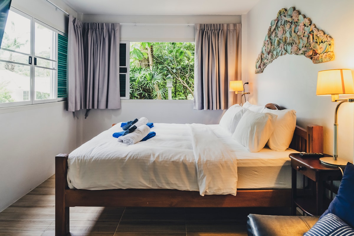 Dette vidunderlige feriehus har en fantastisk naturudsigt og er omgivet af en kokosnødlund og en tropisk have. Et afsondret fristed for et par eller en familie. Beliggende omkring 5 minutters gang fra Mai Khao Beach, er det fuldt udstyret med tekøkken og højhastigheds-wifi til underholdning og arbejde. Der er gratis cykler til rådighed for alle gæster, så de kan udforske området. Ferieboligen er et sted, hvor du kan forfriske dit sind og din krop og nyde naturens stille lyde.