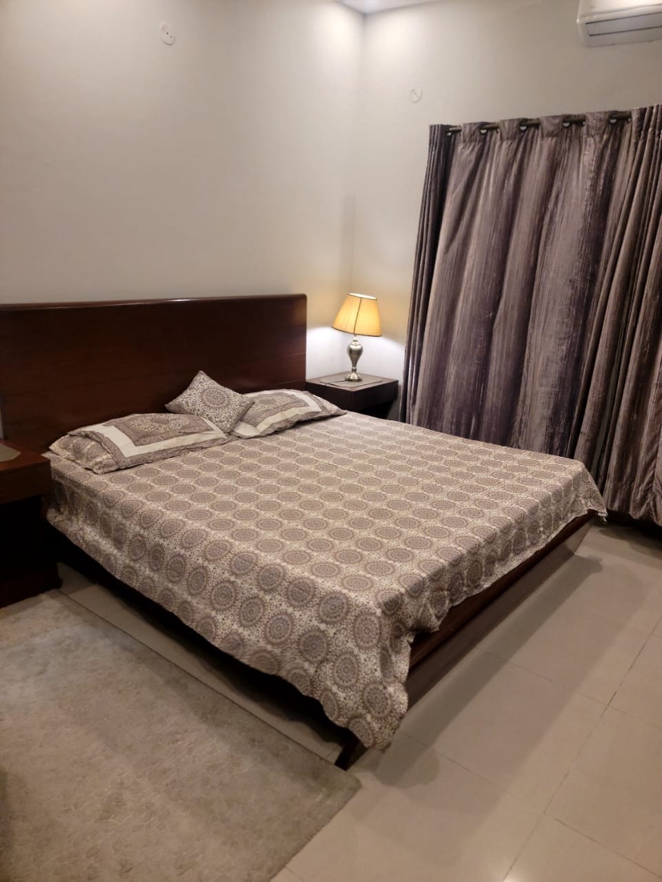 Nyd et hyggeligt ophold i dette moderne, godt oplyste soveværelse med stilfuld indretning, blød sidebelysning og elegante møbler. Den varme atmosfære skaber den perfekte ramme for afslapning, mens gennemtænkte detaljer som siddepladser, kunstværker og førsteklasses finish giver komfort. Denne bolig ligger i det bedste område i Lahore og er ideel til korte eller lange ophold, uanset om du rejser i forbindelse med arbejde, fritid eller en weekendtur. – Dette billede er digitalt iscenesat for at vise belysningsstemning – den faktiske opsætning kan variere en smule