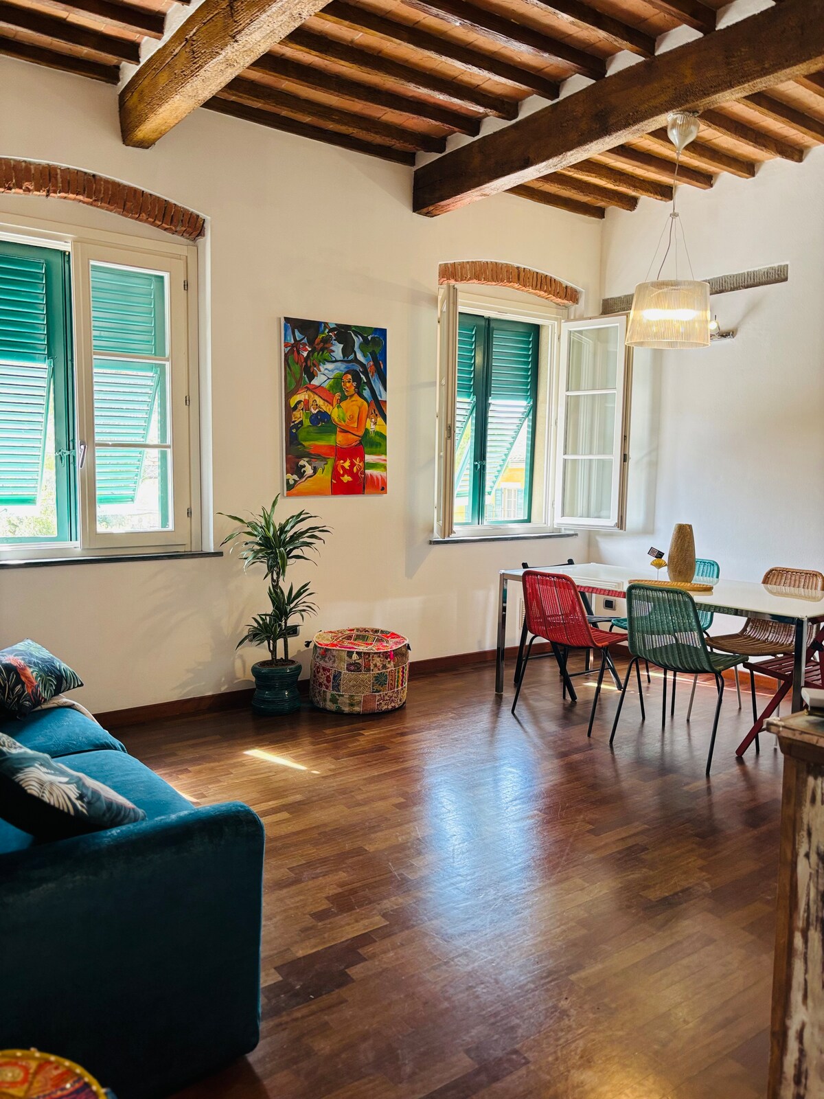Et gammelt tårnhus i hjertet af Pisa. Et fuldt udstyret køkken i rustfrit stål med espressomaskine og kedel. Interiøret blander træbjælker, stål og glas med en svingende hængekøje, designerlamper, en pladespiller og et omfattende bibliotek med kunst- og illustrationsbøger. Soveværelset er tilgængeligt via en intern trappe, mens lejligheden ligger på loftet (3. sal) i en historisk bygning: trappen er lidt stejl, så desværre er den måske ikke behagelig for alle.