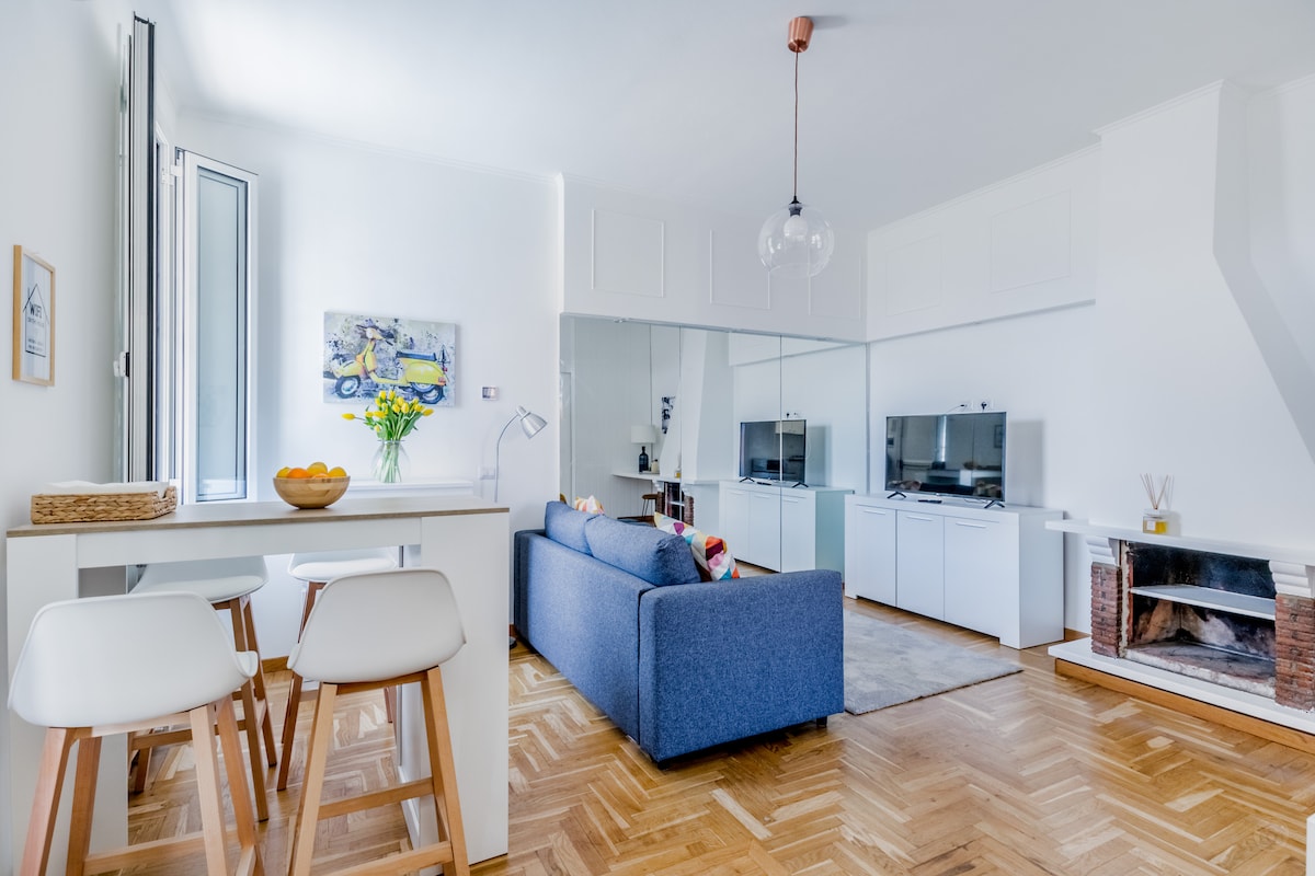 Farverig nyrenoveret lejlighed med en levende kunstnerisk atmosfære, kun 2 minutters gang fra Termini station og 5 minutter fra Repubblica metrostation. Du finder alt, hvad du har brug for under dit ophold: et fuldt udstyret køkken med køleskab, mikrobølgeovn, vaskemaskine og opvaskemaskine, et hyggeligt badeværelse med en stor brusekabine, et stort soveværelse med en kingsize-madras, en sovesofa, der kan rumme 1 ekstra gæst, aircondition, tv og en fungerende grammofon.