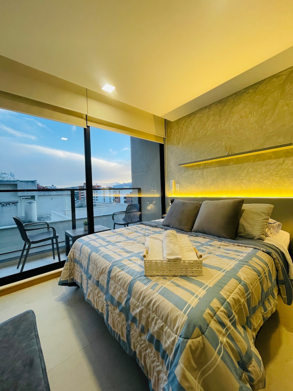 Dette sted er unikt og har sin egen minimalistiske stil, det har luksuriøse rum, hvis du ønsker at tilbringe en romantisk aften med din partner, har vi en privat jacuzzi, en fantastisk udsigt i de forskellige omgivelser, queensize seng, privat grillplads, pejs med Bluetooth-lydudstyr, Netlife internet, 65 tommer tv og Netflix, privat LG Smart tørretumbler, elektriske gardiner, sikker elektronisk adgang, beliggende i en af de bedste sektorer i Quito, fester eller kæledyr er ikke tilladt