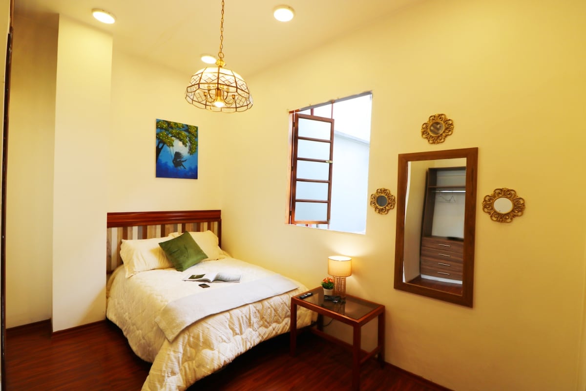 Vores familiedrevne hotel ligger i Quitos historiske centrum 🏛️og tilbyder et unikt ophold i et restaureret neoklassisk hus. Værelset, der er ideelt til 2-4 gæster, har en queensize-seng og to enkeltsenge, privat badeværelse med varmt vand, fladskærms-tv, WiFi og morgenmad inkluderet. Dens private balkon har udsigt over basilikaen og El Panecillo, og værelset er indrettet med et vægmaleri malet af kunstnere fra Quito School of Art.