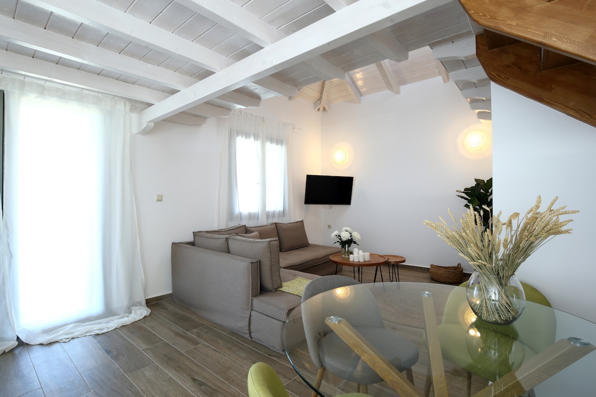Kaminia Blue ligger på landet i Tsoukalades og er en smukt udformet sten- og træhytte kun 100 meter fra den rolige Kaminia-strand. Denne charmerende oase kan rumme op til 5 gæster og har to soveværelser, en hyggelig sovesofa, et fuldt udstyret køkken og et rummeligt badeværelse. Gæster sætter pris på udendørsbruseren, grillen og den frodige have, der forbedrer atmosfæren. Vågn op til en betagende udsigt over havet og solopgangen samt de fantastiske strande i Agios Ioannis og Myloi.
