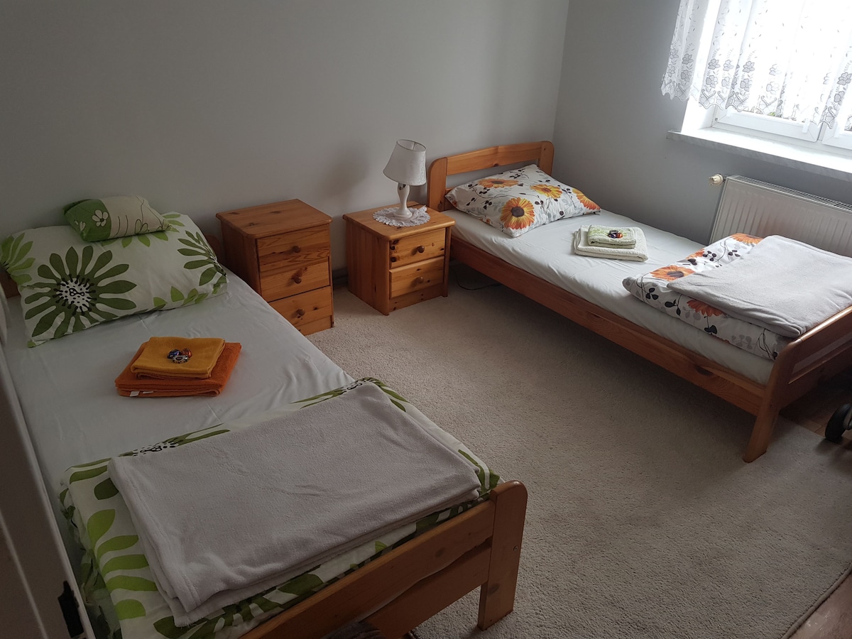 Apartament dwupokojowy 56m2 z balkonem na I kondygnacji .Oddzielne wejście. Sypialnia z TV, dwa łóżka pojedyncze które można zestawić. Duży pokój z TV, łóżko 2-osobowe Salon: łóżko narożnikowe+ łóżko pojedncze ( w komodzie) + dwa łóżka pojedyncze z możliwością zestawienie. Obydwa pokoje klimatyzowane. Kuchnia w pełni wyposażona wraz ze zmywarką . W łazience pralka, żelazko. W apartamencie WiFi. Bezpłatny parking.