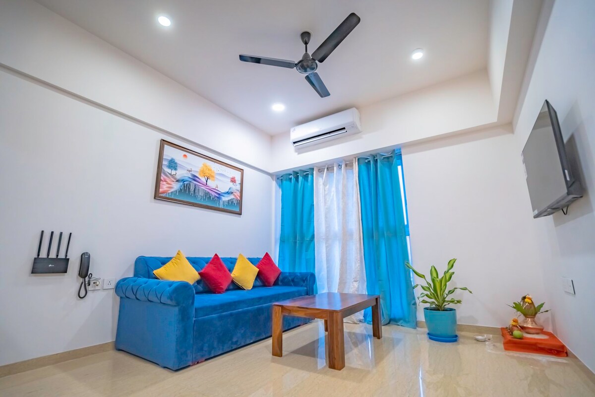 Unwind in this peaceful 1BHK retreat with a cozy balcony overlooking lush green golf views. Enjoy a 65” LED TV, fast WiFi, and calming, artful interiors that blend comfort with soulful design. Whether you're a couple, solo traveler, remote worker, or a small family, this thoughtfully curated space offers everything you need to relax, work, or explore. Located just 30 minutes from Pune, it’s perfect for weekend escapes, mindful stays, and longer peaceful getaways.