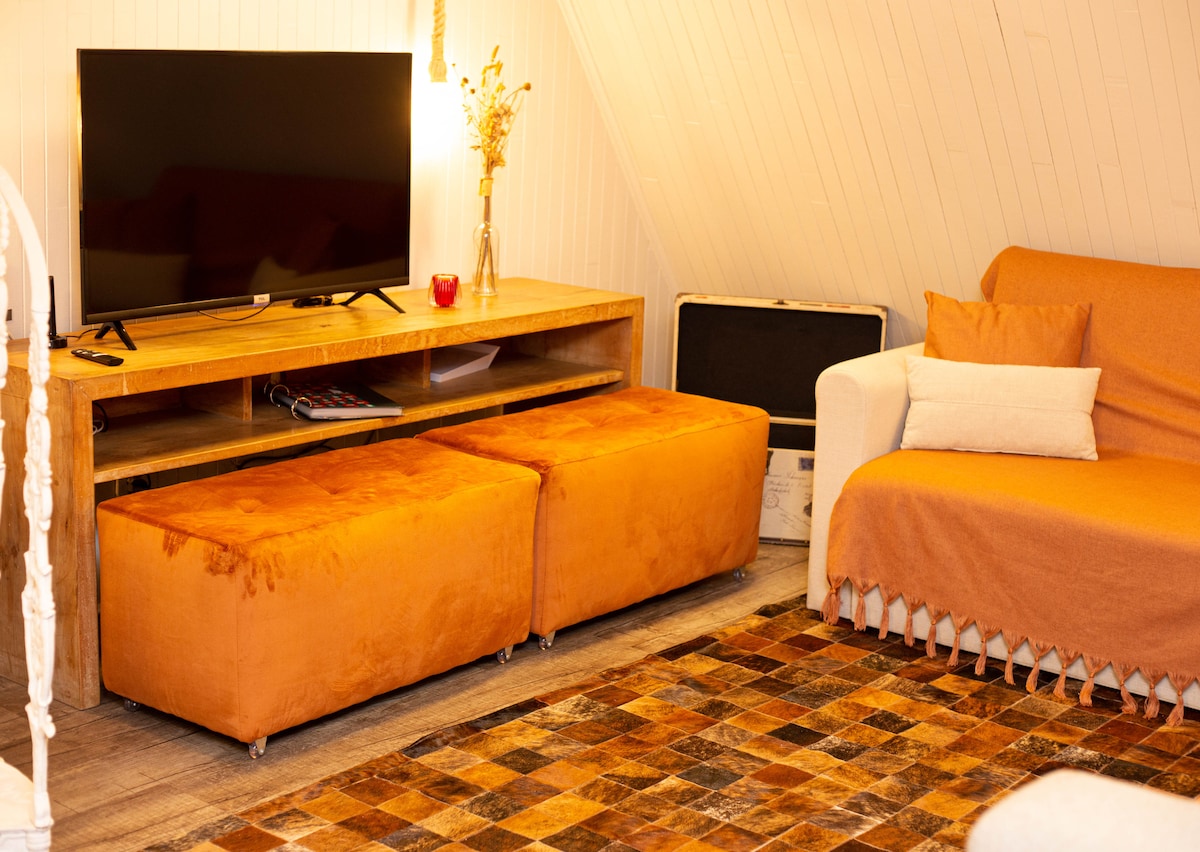 72 m2 (A-ramme stil) hytte (privat) med 2 soveværelser, utrolig udsigt. VI SERVERER IKKE MORGENMAD VI ACCEPTERER IKKE KÆLEDYR VI ACCEPTERER IKKE ELBILER ✔ Pejs ✔ Smart-tv 40" ✔ WI-FI ✔ Hjemmekontorbord ✔ Køkken ✔ Varmt vand i køkkenet og badeværelset ✔ Vugge ✔ Nespresso-kaffemaskine ✔ hårtørrer ✔ Foundee-apparat ✔ Alexa ✔ Hydromassage med farveterapi foran glashytten Eksternt område: Gourmetområde ✔ med grill, vask og bord ✔ Lejrbål ✔ 1 Pergolado ✔ Parkering