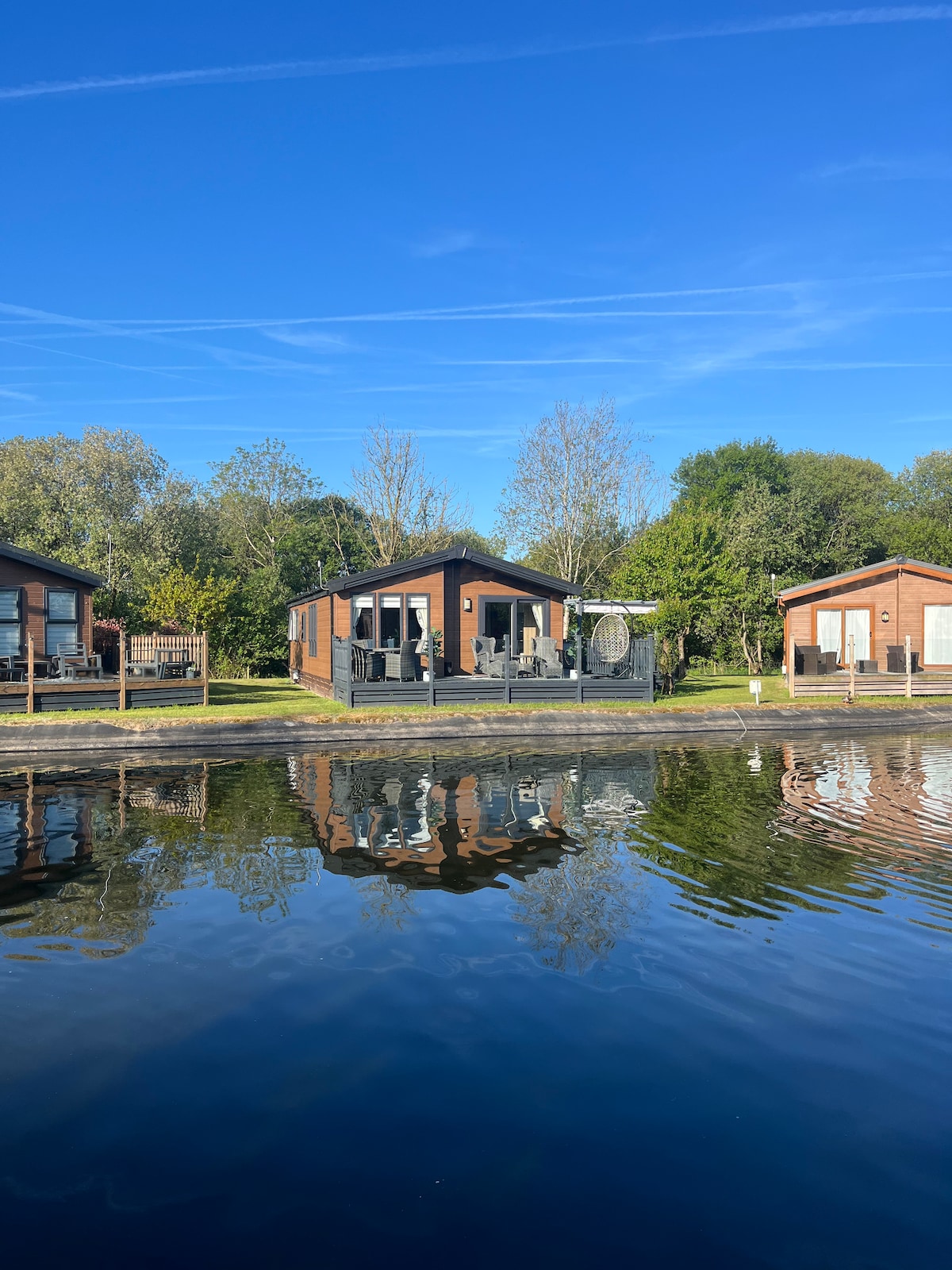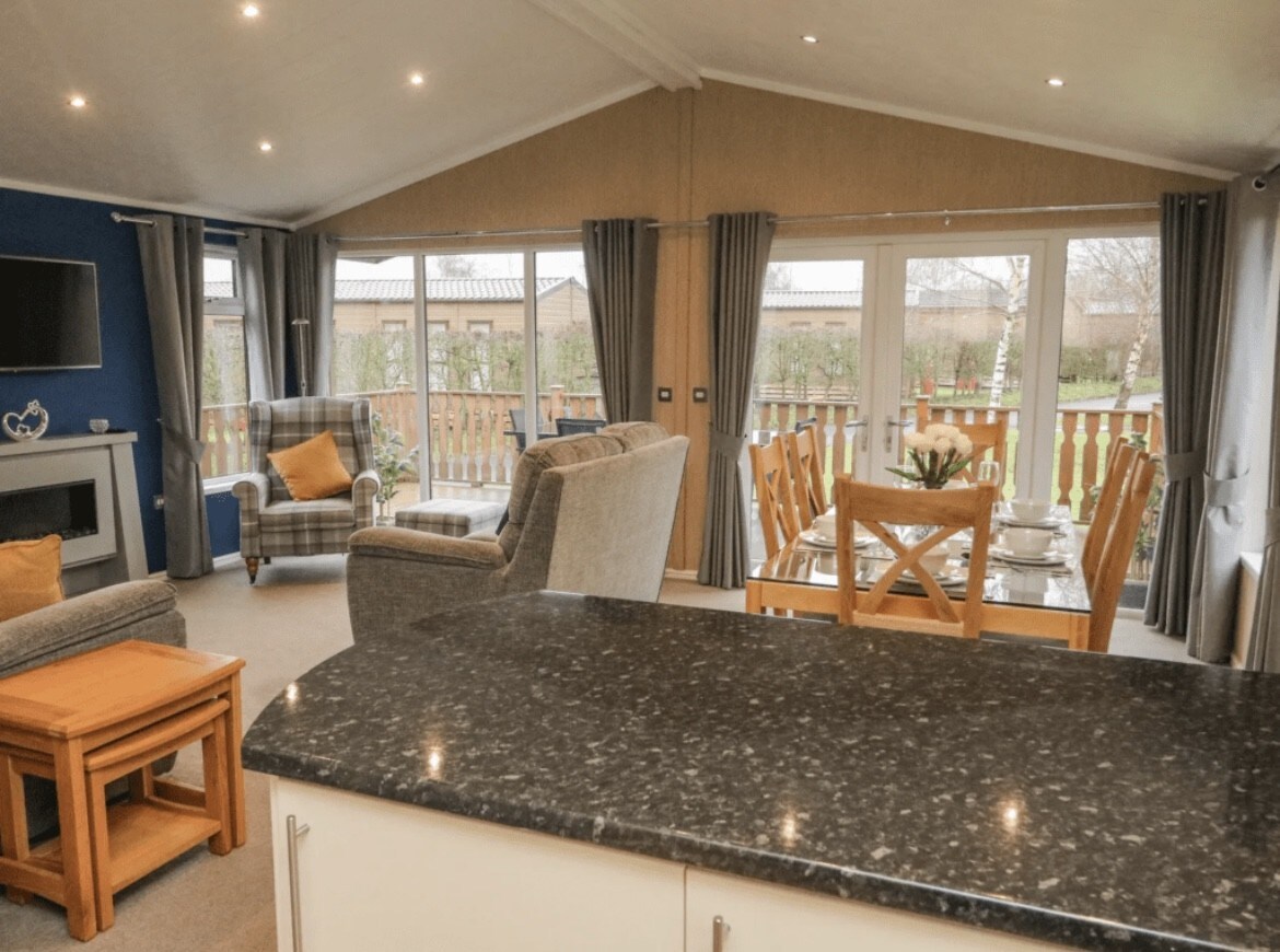 Keer Lodge enjoys an enviable location on the lake shore at the exclusive Pine Lake resort near Carnforth with uninterrupted views of the Lake and hills beyond from the lounge and patio. Open plan living and furnished in a modern Scandinavian style with plush leather sofas, a fully fitted kitchen, luxury Simba hybrid mattresses, a piping hot walk in shower and central heating throughout you will feel at home the minute you step through the door.