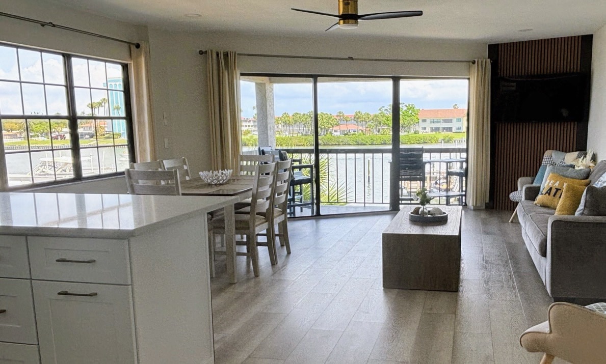 Welcome to the newly remodeled condo in the Heart of Treasure Island. This bright and modern retreat is perfect for relaxing and avoiding the crowds. Perfect location for beach lovers and wildlife watchers alike with waterfront views of the canal from the living room, kitchen and bedroom windows and beautiful sunsets. Just 2 blocks or a 5 minute walk to the beautiful white sandy beach and a few feet from the canal and heated pool. Visit nearby restaurants, John's Pass Boardwalk and live music.