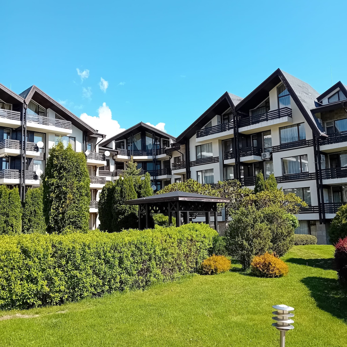 Vores sted er ideelt til et kort og længerevarende ophold. Renoveret for et år siden, det er i et meget roligt og fredeligt område, men få minutters gang til centrum af Bansko og skiliften. Den er fuldt udstyret med alt, hvad du har brug for - vaskemaskine/tørretumbler, opvaskemaskine, Smart TV, nyt aircondition. Vores gæster kan bruge swimmingpoolen og fitnesscentret gratis. Damprum og sauna mod et ekstra gebyr. Nyd din morgenmad på balkonen med udsigt over den fantastiske udsigt over bjergene.