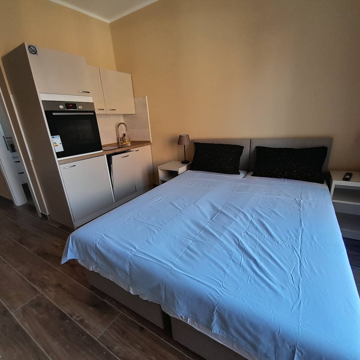 Modern apartment for 4 in the newbuild house on the beach with a sea view. One cozy bedroom, spacious bathroom with walk-in shower, kitchen with all necessary appliances, dining area, living room with big couch, balcony with the sea view and sitting area. Airconditioned, LCD/SAT tv, free parking and wi-fi. Close to restaurants and dining, family-friendly activities, nightlife and public transport. Apartment good for couples, business travelers, and families with or without kids.