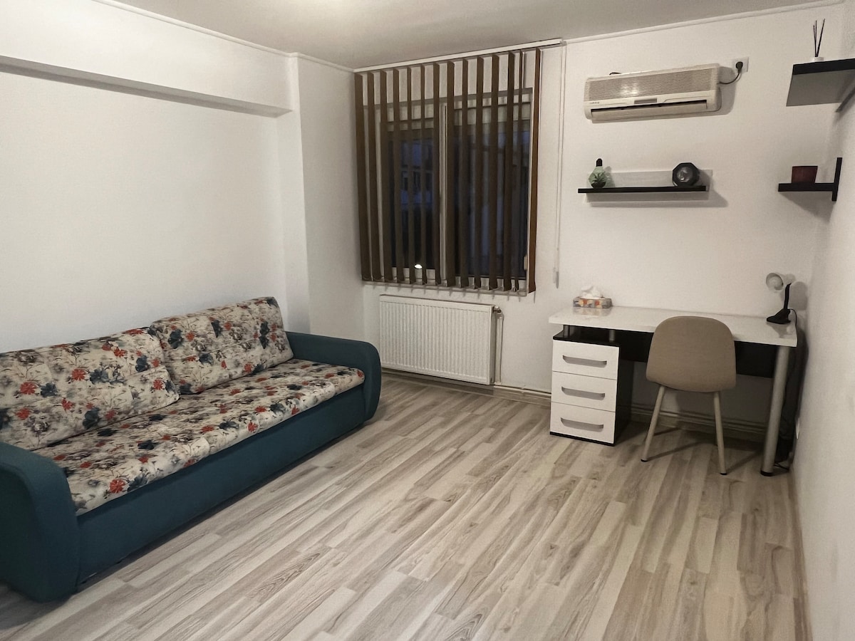 Cozy Place Pitesti. It s good for couples, solo adventures and business travelers. Entirely new decorated place with new furniture and appliances, located in the heart of Pitesti s downtown, near a lot of restaurants, coffe shops, supermarkets. The 1st floor studio has a sleeping area with an extensible couch for 2 people.The studio has a fully equipped kitchen, fridge, gas cooking , electric oven, coffee machine, washing machine, cable TV, free Wi-Fi,free public parking in the back of building.