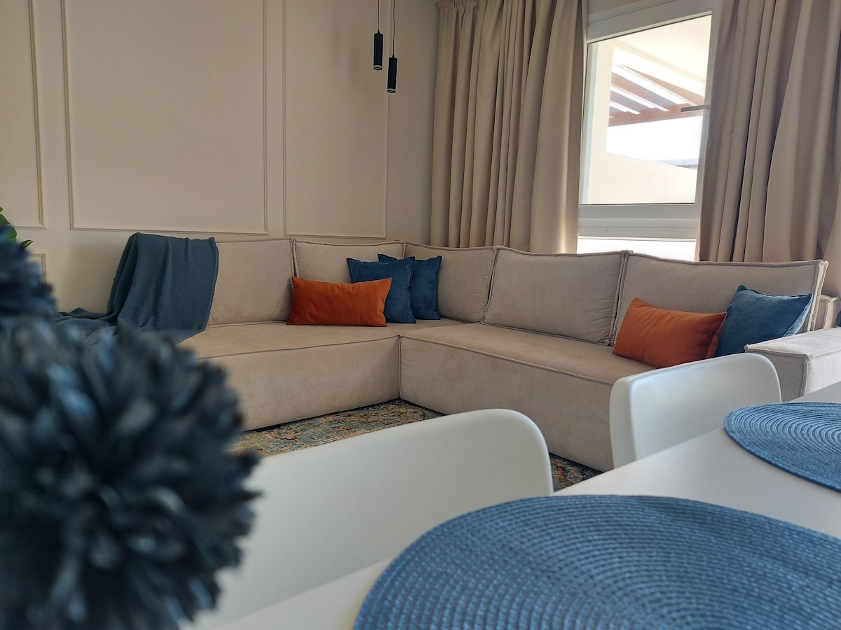 ✨L'appartement Panoramique à les jardins bleus se caractérise par son design à la fois moderne et élégant, chaque élément étant soigneusement conçu pour vous garantir une expérience sans pareille ✨Son emplacement central ✅ Appartement avec vue panoramique sur la mer et à proximité de : ✅ 1 min de la plage de Martil 🏖 et sa fameuses corniche ✅ 5 min de la Plage de Cabo Negro 🏝 ✅ 4 min de Ikea et KFC 🍗 ✅ 6 min de Marjane et McDonald's 🍟 ✅ 1 min restaurants cafés, commerces