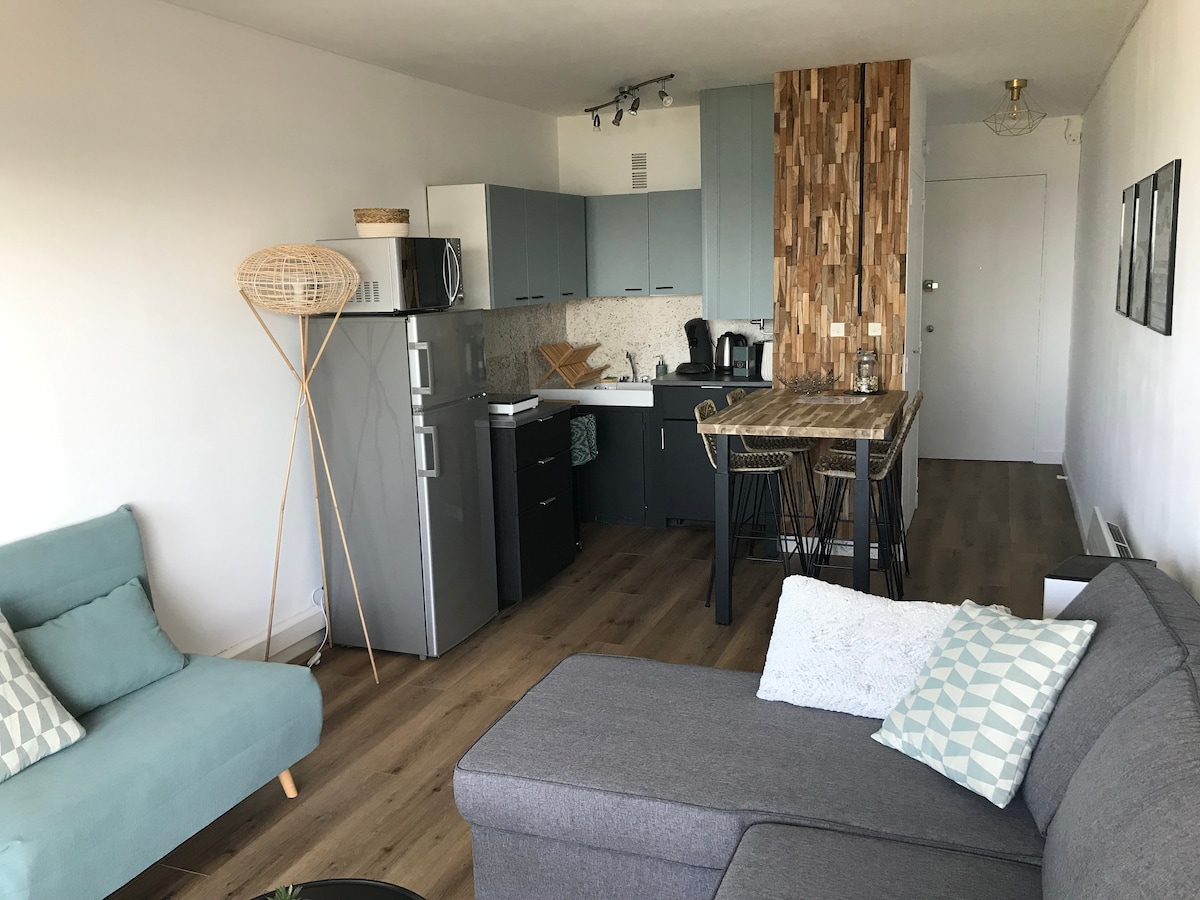 studie ved havet med fantastisk udsigt, 2. sal. 2 min. AQUABAULE (havvandspool, hammam,sauna, marinebane) komfortabel, lys renoveret af indretningsarkitekt. foldeseng 160, mikrobølgeovn, fryser, køleskab, kaffemaskine, kedel, nespresso, hårtørrer, strygejern, opvaskemaskine, induktionskogeplade, emhætte, smart-tv, wi-fi gratis parkering i nabolaget terrassestole bord 2 liggestole Der er håndklæder og sengetøj