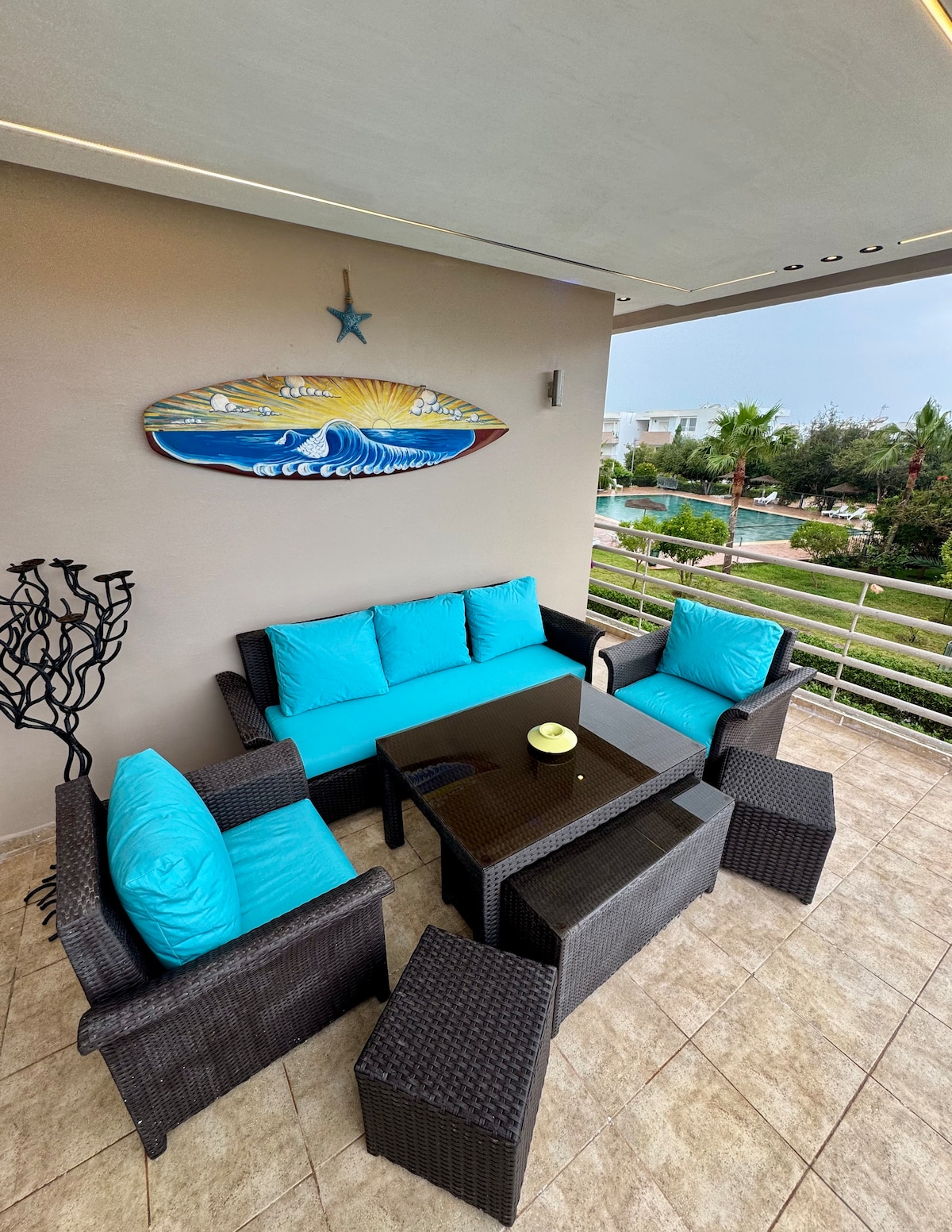 Charmerende lejlighed i Taghazout Bay, kun 2 minutter fra stranden. Beliggende i en sikker bolig med to swimmingpools og en golfbane. Lejligheden har et soveværelse med en dobbeltseng, en stue med modulopdelte sovesenge, et fuldt udstyret køkken og to badeværelser. Slap af på terrassen, der er ideel til at nyde stille øjeblikke. Gå ikke glip af denne mulighed! Book i dag, og få en uforglemmelig oplevelse ved Taghazout Bay.