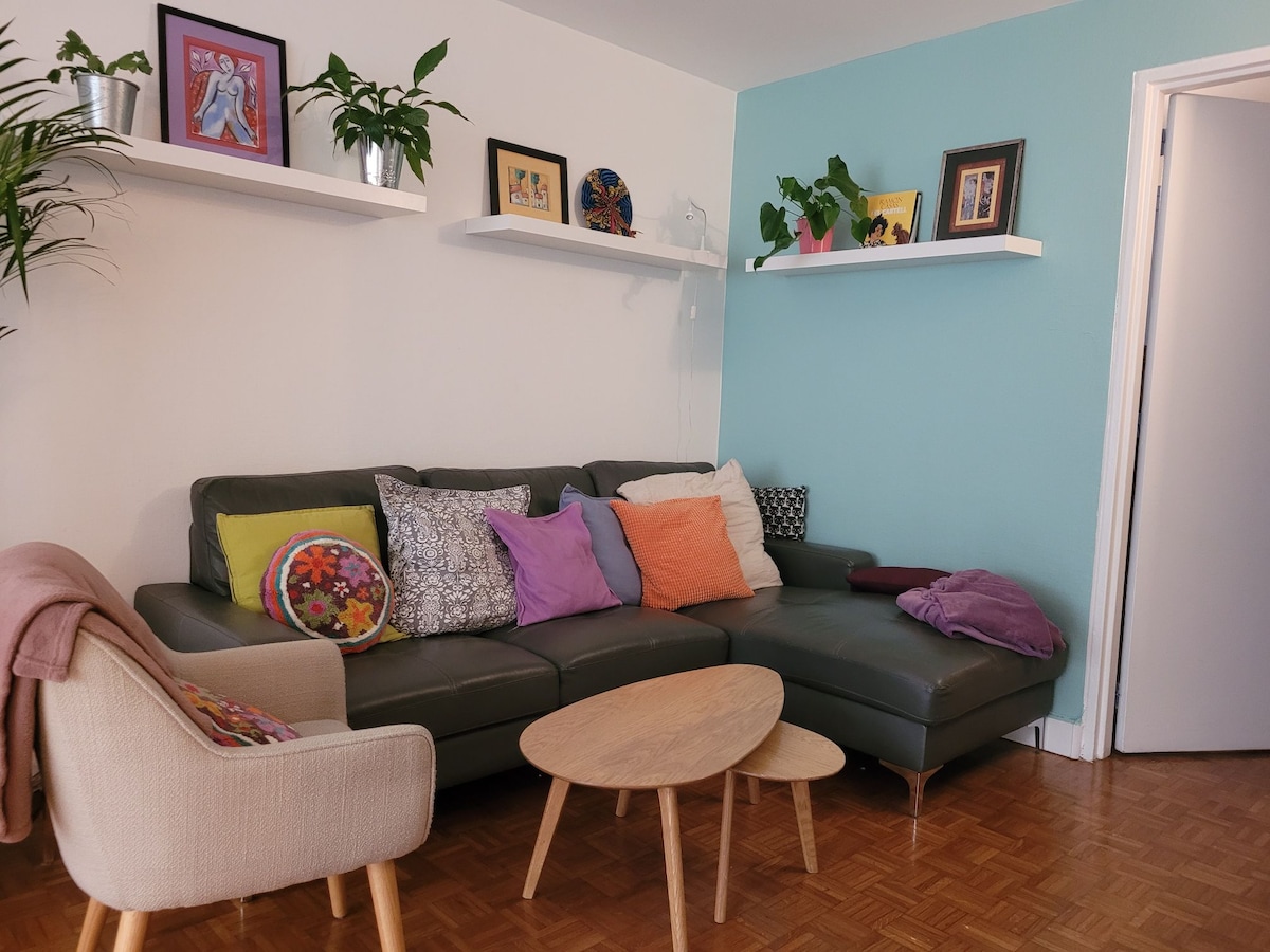 Bemærk venligst, inden du booker: Nøgler opbevares i et nøgleskab syv minutters gang fra lejligheden. Åbningstider: Afhentning fra kl. 15.00 til midnat Aflevering fra kl. 9.00 Læg din bagage ned, og nyd vores store lejlighed i loftsstil med en fantastisk, uhindret udsigt over Paris' hustage. Vi vil med glæde byde jer begge velkommen til vores farverige, rummelige kokon, der er møbleret, ligesom den er, da vi flyttede ind: velkommen hjem!