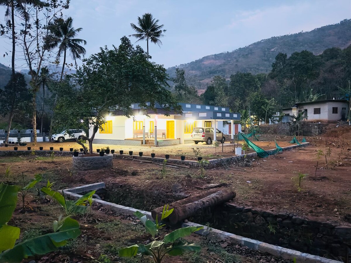 Marmala vandfald : 9 min (3,5 km) via Teekoy - Mangalagiri Road Vagamon: 40 min (20,3 km) via Erattupetta - Vagamon Rd 🔑 Ind- og udtjekning • Indtjekning: Fra kl. 12.00 • Udtjekning: Senest kl. 9.00 Velkommen til dit andet hjem! Vores rolige tilflugtssted på landet tilbyder den perfekte blanding af komfort og charme med en betagende udsigt over bjergene. Slap af med hele familien i dette fredelige overnatningssted.