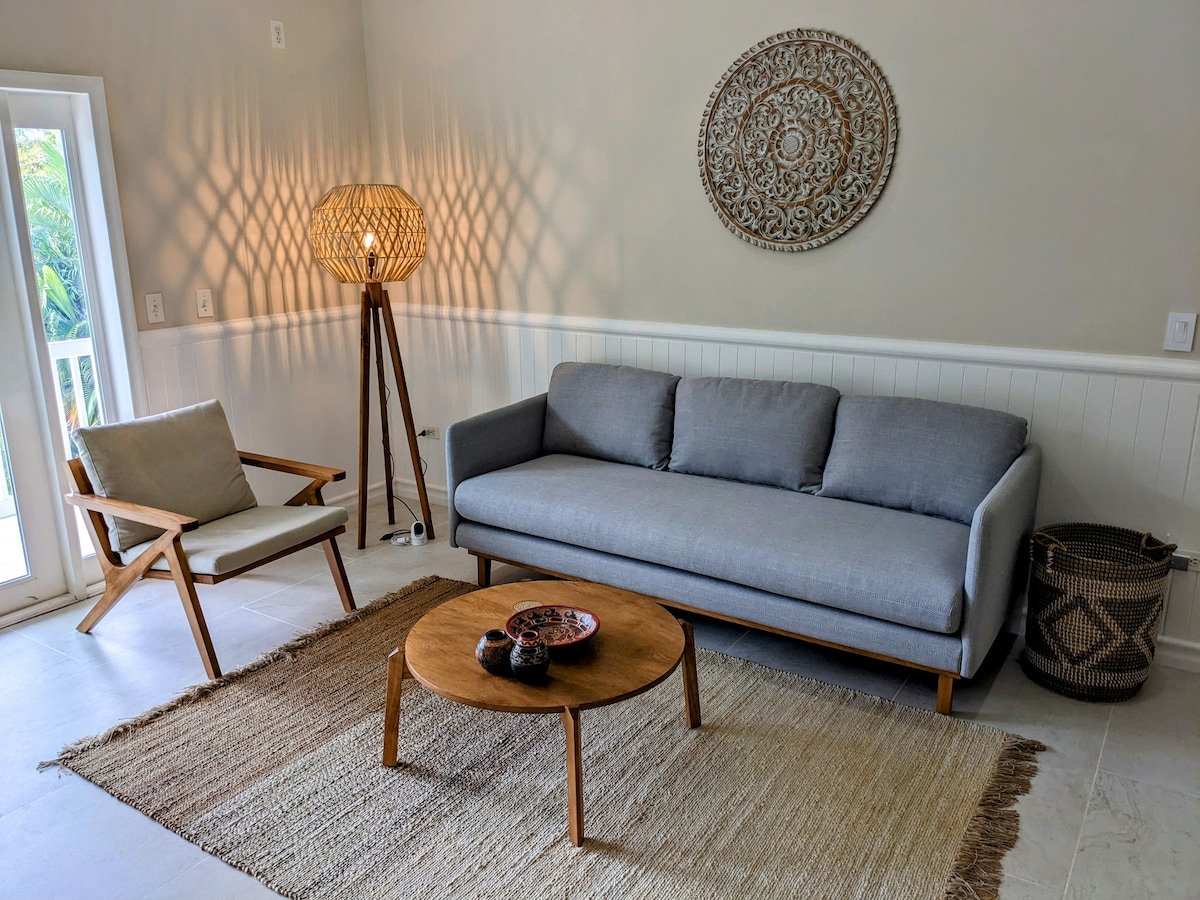 Thoughtfully designed, this elevated and high ceiling house offer all the comfort and convenience needed for both short and extended stays. - Loft bedroom with queen-size bed - Living room, sofa bed (medium) - Spacious and sunlit - Desk - Bathroom w/ rain shower - AC, ceiling fans - 100mb Wi-Fi - Safe box - Fully equipped kitchen (stove, fridge, microwave, coffee maker, more. - Covered terrace - Large sliding glass doors (w/ screens) - Laundry - Pool - Outdoor shower - Private & secure parking