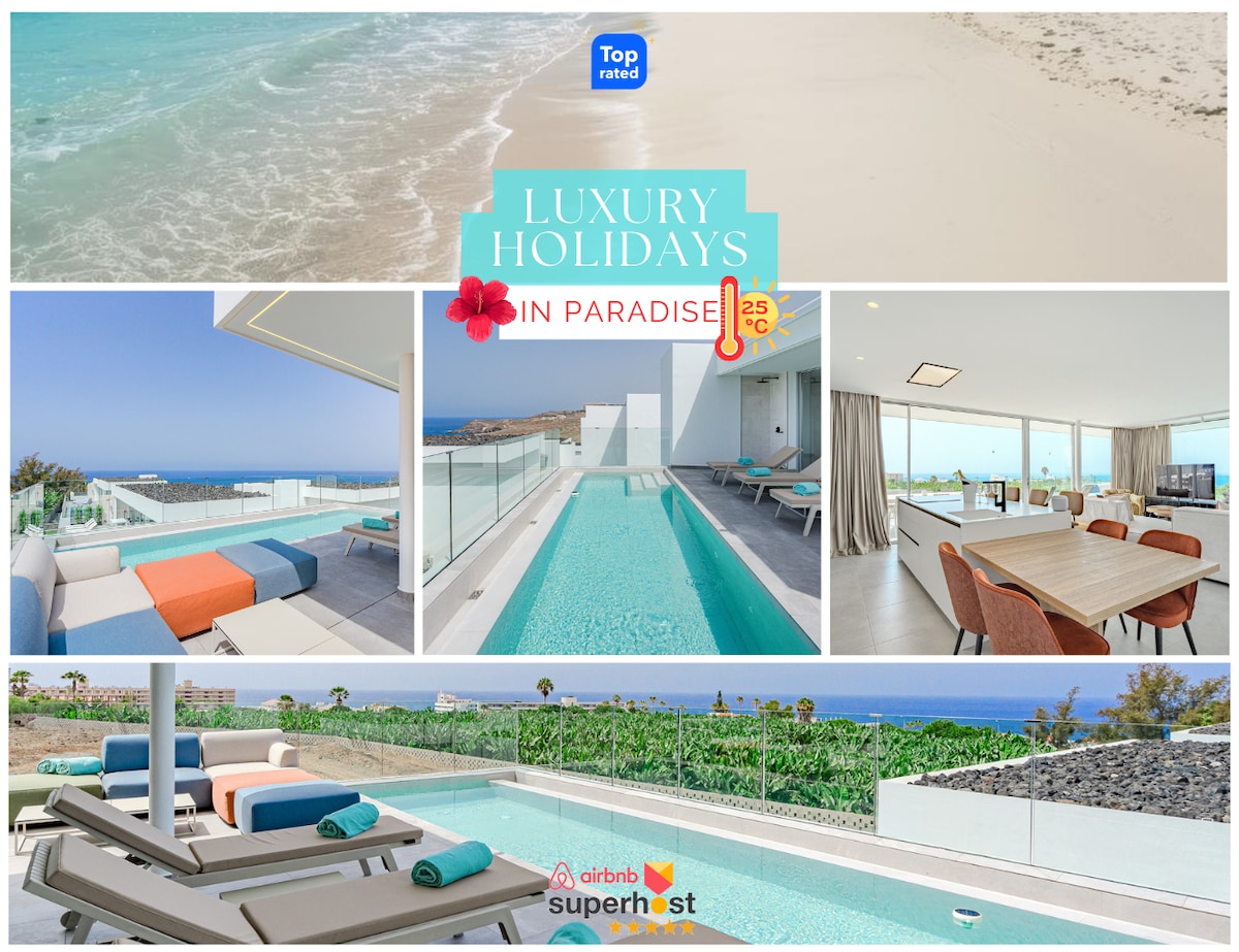 Luksusvilla • Tagterrasse med udsigt over solnedgangen • Opvarmet pool