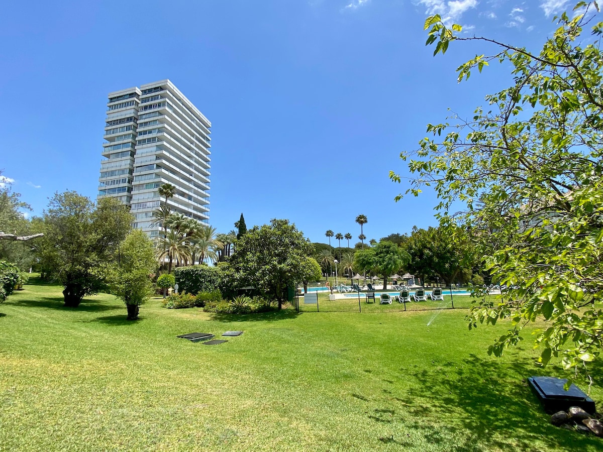 Lejlighed ved stranden i Marbella Center med to pools og parkering