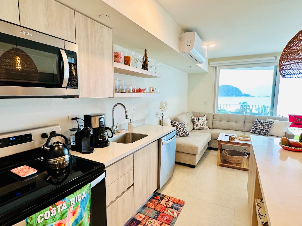 NY BYGNING PÅ STRANDEN! I hjertet af Jaco-stranden, 300 meter fra The Strip, gå til overalt. 2 kingsize-senge, 2 badeværelser, 1 queensize-dobbeltseng, 8. etage, solnedgange, solopgange, lyd af bølger, 2 pools, med hav, bjerge og udsigt over byen. Superhosts tilbyder mange faciliteter, privatliv i en døgnåben sikret bygning, fitnesscenter, fælles arbejdsområde, grillplads og en utrolig 13. etage solnedgangsdæk med glasgulv. Dette 2 soveværelser er en del af låsen med 3 soveværelser og studiolejlighed. Sjældent tilbydes.