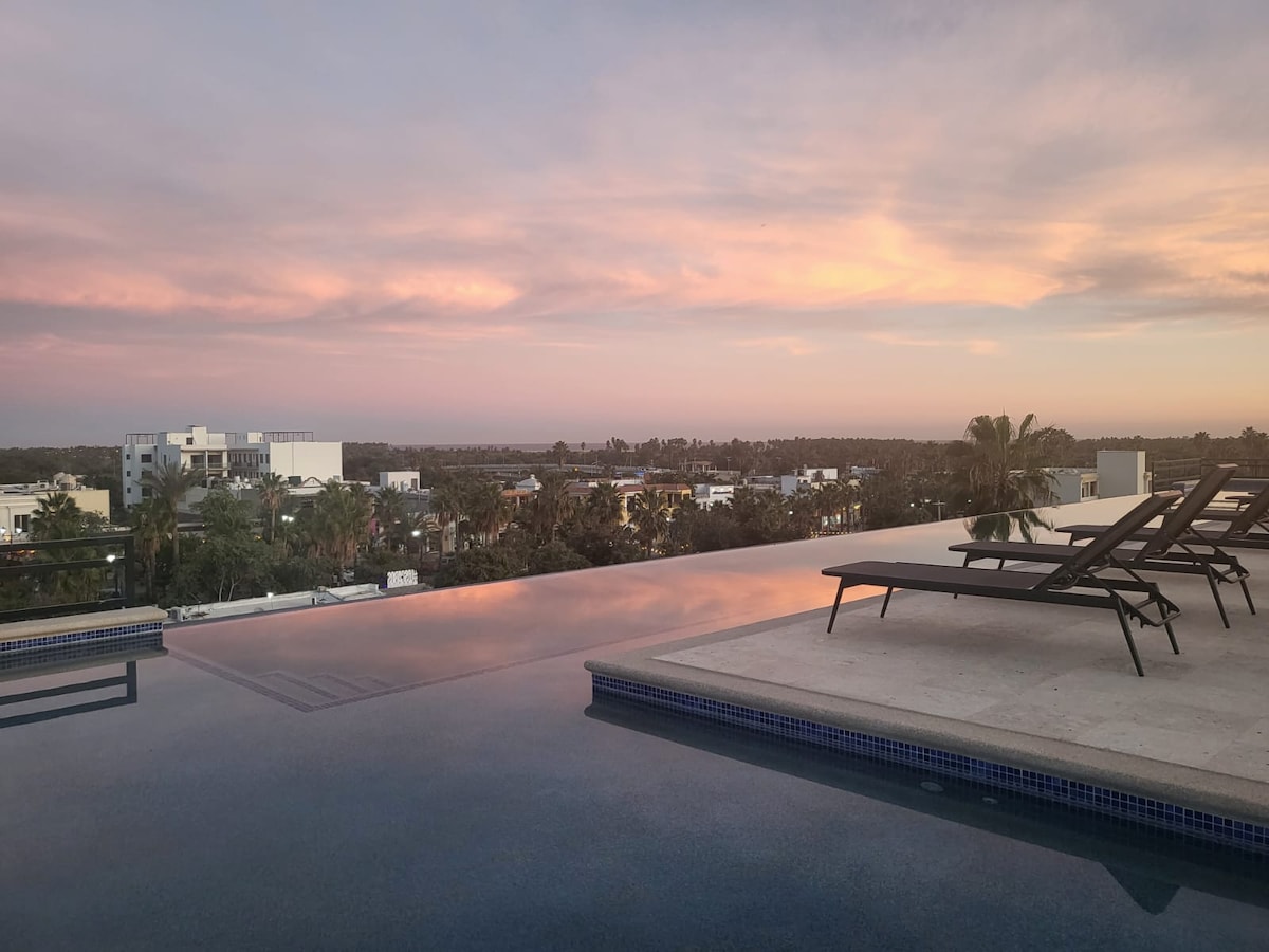 Lejlighedens 180º udsigt giver dig mulighed for at nyde solopgang og solnedgang ved Cabo Arch fra dit morgenmadsbord! Terrassedesign tilbyder intimitet og flugt. Ideel til et romantisk ophold, hjemmekontor med udsigt over paradiset, grillmiddage med udsigt til solnedgangen, afslappende hængekøje-siestas, hvalsafari, mens du laver mad, og udsigt til solopgangen fra sengen! Adgang til Cabo's to bedste strande og ved siden af The Cape og Thompson Hotel. Husk, at dette er en udlejningslejlighed, ikke et hotel, og prisen afspejler det.