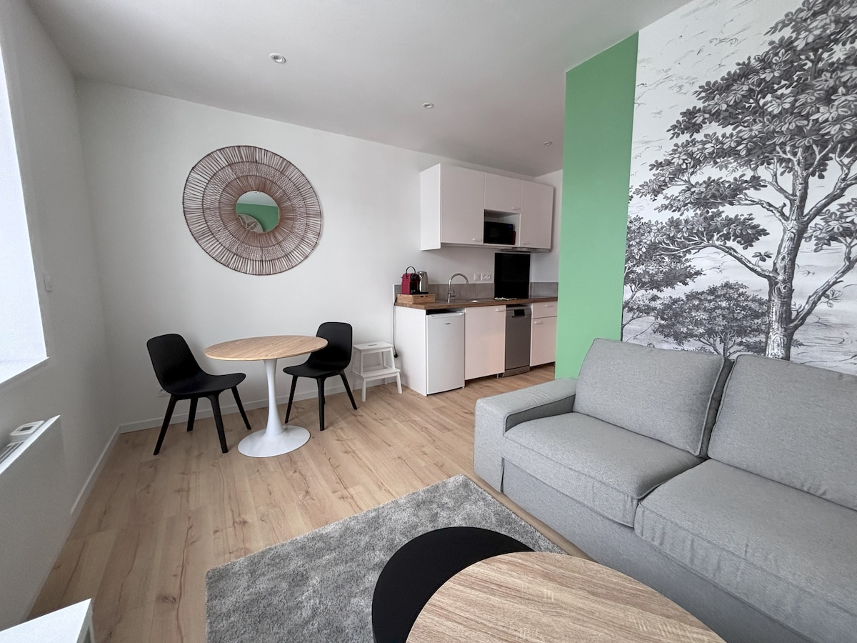 Hyggeligt atelier T1 bis i Plougastel-Daoulas, tæt på landsbyen. Slå dig ned i denne smukke moderne og lyse kokon, der er ideelt placeret tæt på butikker og transport. De fredelige omgivelser inviterer dig til at slappe af, samtidig med at det er praktisk at opdage halvøen. Boligen er perfekt udstyret til to personer: sengen er redt ved ankomsten, pæn velkomst og alle fornødenheder til et behageligt og ubekymret ophold.
