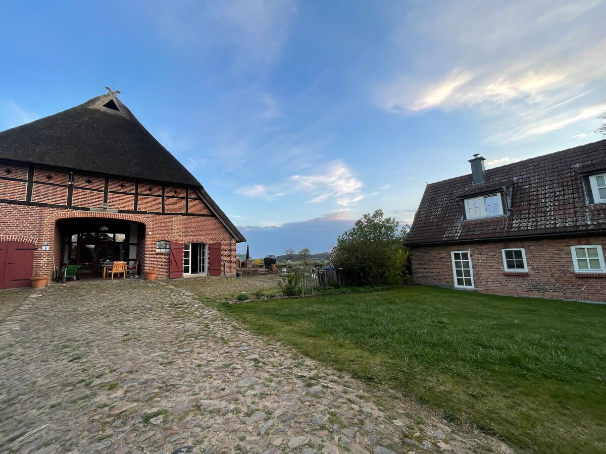 Ferielejlighed BehrenSCHLAF overnat i en stråtækt bondegård og oplev naturen og landskabet efter en god nats søvn. Bondegården, der blev bygget omkring 1780 som et røghus, er fredet og er blevet kærligt bevaret. Du overnatter i vores hyggelige ferielejlighed med terrasse på sydsiden og udsigt over vores have. En dobbeltseng og en foldbar sovesofa giver 2 gæster mulighed for at sove komfortabelt, men der er også plads til 4 personer. Vi glæder os til at se jer! Familien Behrens