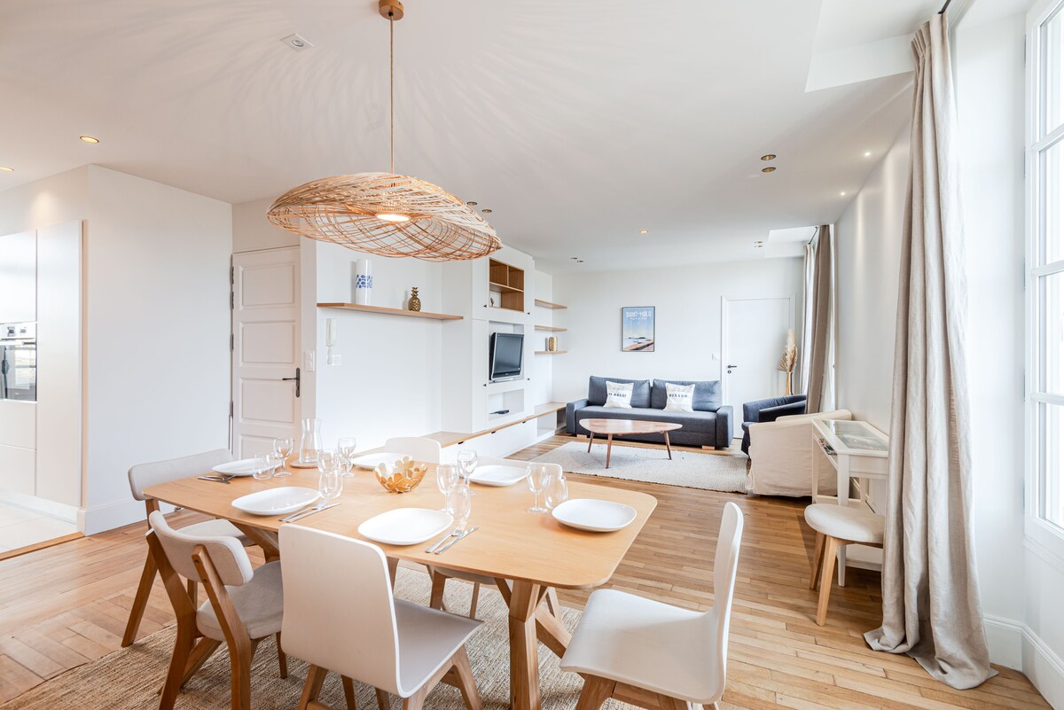 Smuk lejlighed fuldstændig renoveret (70 m2), på diget, lys med havudsigt i alle rum. Ugentlig leje for 3 personer i ferier. I stueetagen: 2 soveværelser med 3 senge Stor stue og spisestue med veranda, havudsigt og privat have, tv og internetadgang. Fuldt udstyret amerikansk køkken. Luksusbadeværelse Direkte adgang til stranden Inden for gåafstand til butikker og marked (5 min) Privat GARAGE ved reservation valgfrit (12 €/dag)