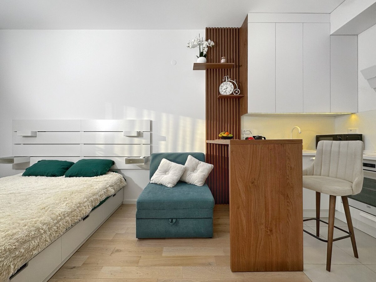 Vi tilbyder rabat på længerevarende ophold. Beliggende i et grønt og roligt område, kun 450 meter fra den vigtigste bus- og togstation, og omkring 25-30 minutters gang til Bars bymidte. Et soveværelse med dobbeltseng, friskt sengetøj, garderobe med bøjler og strygejern En stue med et bord og tre stole, en sovesofa, et tv, højhastighedsinternet og aircondition Et kompakt køkken med ovn og lille køleskab Et badeværelse med bruser og vaskemaskine Turistskat på 1 €/dag er ikke inkluderet.