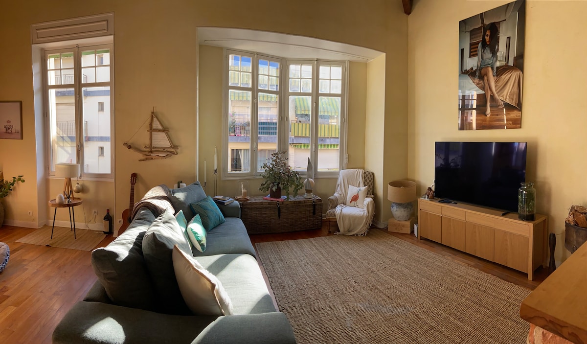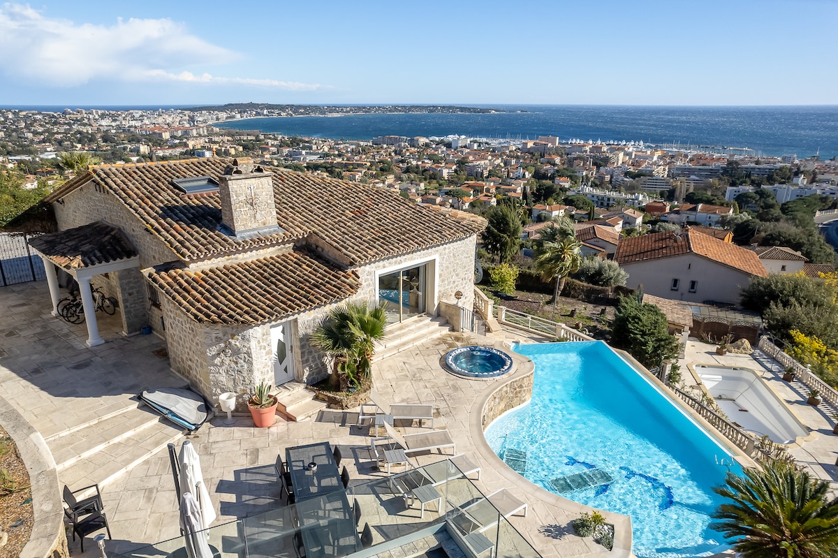 Masser af plads og lys i bohemeagtig stil med et strejf af moderne kunst. Udsigten inden for 180 grader er åndeløs og fører dig til fjerne horisonter. West le CAP D'ANTIBES, east les ILES DE LERINS. Lige over den gamle havn og restauranterne yachter cruisent og dock. To fantastiske strande i 300 og 600 meter til fods. bymidte og station på 5 minutter til fods, Nice lufthavn på 30 minutter med bus eller tog . God fornøjelse!