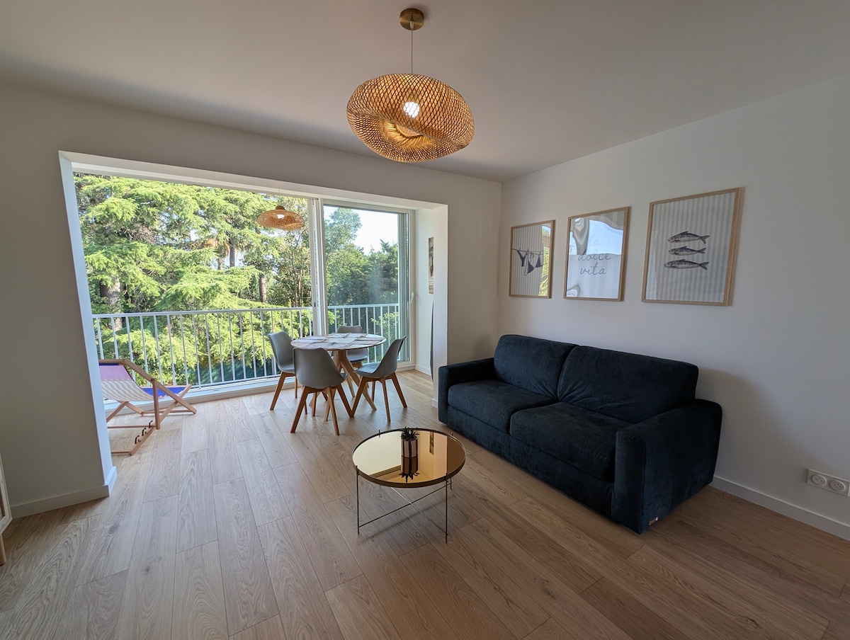 30 m2 studie i stueetagen i en træbeplantet og sikret bolig, der vil forføre dig med sin ro og charme. Renoveret i 2019, nyt badeværelse i 2023. Tæt på strande, butikker og 3 minutter til togstationen. Fuldt udstyret bolig. Parkeringsplads. Sengetøj og håndklæder medfølger