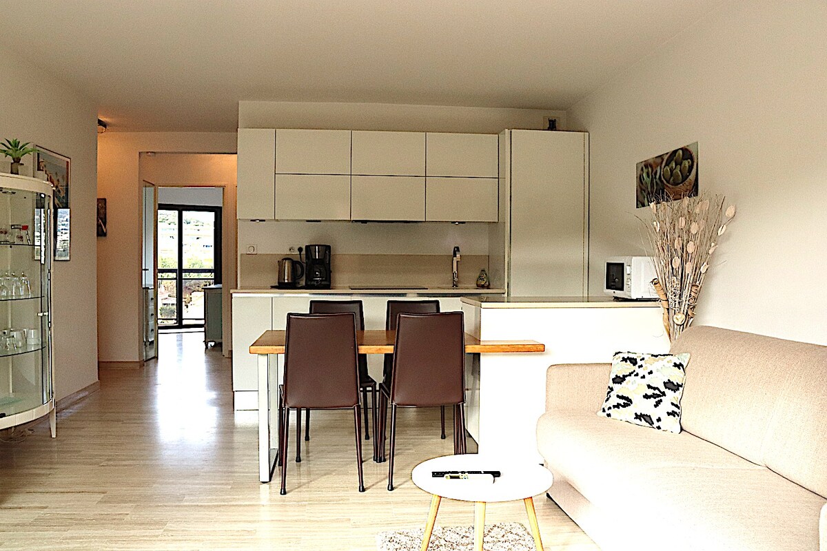 Hej, vi vil med glæde byde dig velkommen i vores 2 værelses lejlighed på 40 m2 og dens private have. Beliggende 200 m fra en fodgængertunnel, hvorfra du kan nå strande og restauranter, reversibel aircondition, udstyret køkken, keramisk kogeplade, amerikansk køleskab, opvaskemaskine, vaskemaskine, tørretumbler, brusebad, separat toilet. Fiber 500 m fra landsbyen med restauranter, butikker, læger, PMU. Tæt på togstationen og offentlig transport. Start på vandresti og mountainbike i nærheden.