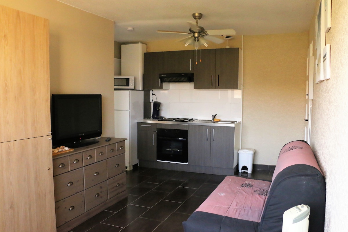 Nyt i 2026: Lejligheden er airconditioneret, og sengen er 160 cm. Smart-tv og ubegrænset wi-fi En stor skovklædt park, en balkon i fyrretræerne, uden udsigt, med en lille havudsigt, i hjertet af La Franqui, 35 m2 studio på anden sal. Stranden ligger 50 meter fra ejendommen. Alle virksomheder i nærheden i sæsonen. Marked mandag og torsdag i perioden juli/august Der er mulighed for parkering i boligen, som er lukket. Sæt bilen ned, og nyd dette stykke paradis.