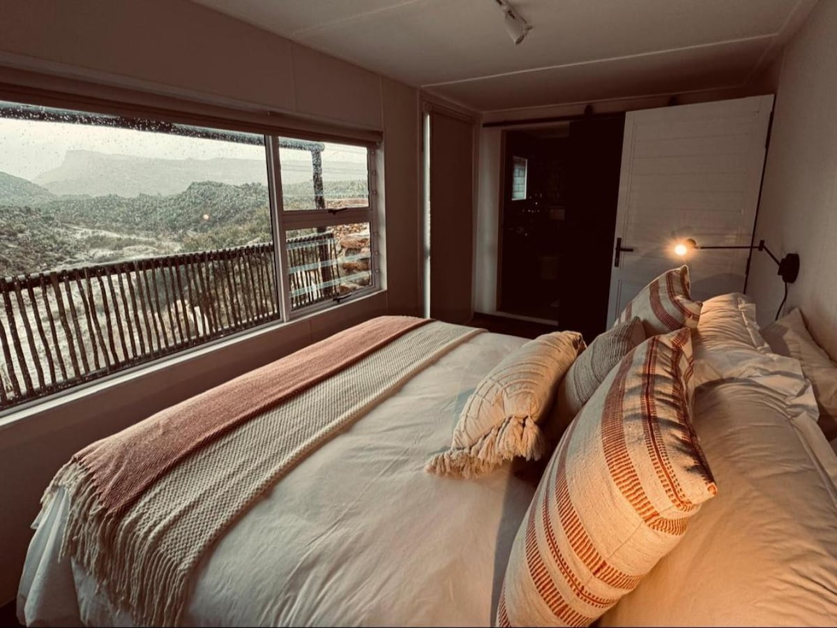 Vores mål er at have dig så tæt på naturen som muligt, samtidig med at du har luksus til at nyde oplevelsen. Vi tilbyder en containerhytte med 2 soveværelser og et stort badeværelse med udsigt over fynbosnaturen. Opholdsområdet, der er forbundet med et lille køkken, strækker sig over en terrasse, der er udstyret med en overdækket grill og spiseplads. Hoveddækket strækker sig til det brændeopvarmede spabad og en hængekøje på terrassen for at sikre, at du kan se stjernerne. En høj profil/høj frihøjde er påkrævet - (SUV/Crossover/Bakkie).