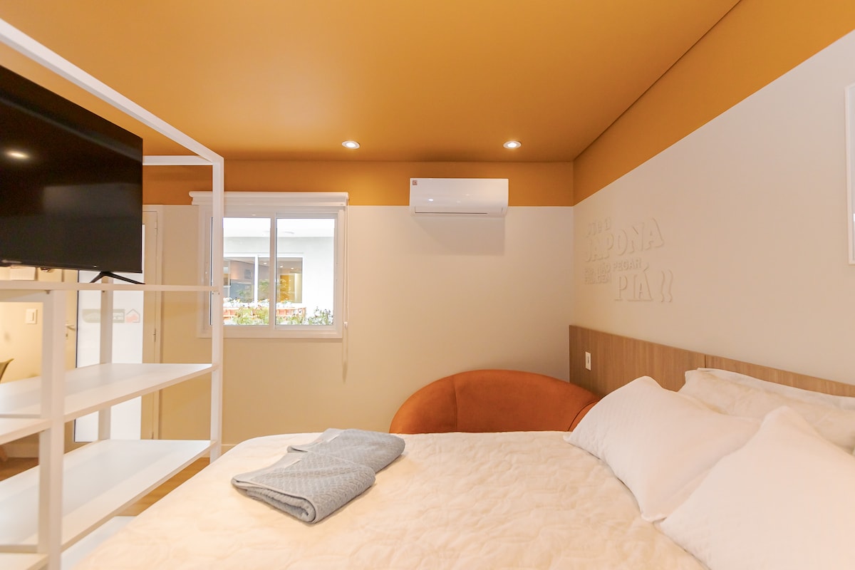 Lejlighed med 1 soveværelse plus stue, moderne og hyggelig, fuldt designet til Airbnb. Garage inkluderet i selve bygningen. hurtig wi-fi og kølig luft Køkken udstyret med køleskab, komfur, mikrobølgeovn, 43" smart-tv, førsteklasses hotelstandard kasse-seng. Tæt på marked, apotek, Shopping Curitiba og bageri. vinduer med begrænser og sovesofa, så du kan tage dit barn/dine børn med uden problemer. Moderne bygning med komplet og udstyret fitnesscenter, opvarmet swimmingpool, festlokaler og fritidsområde på taget