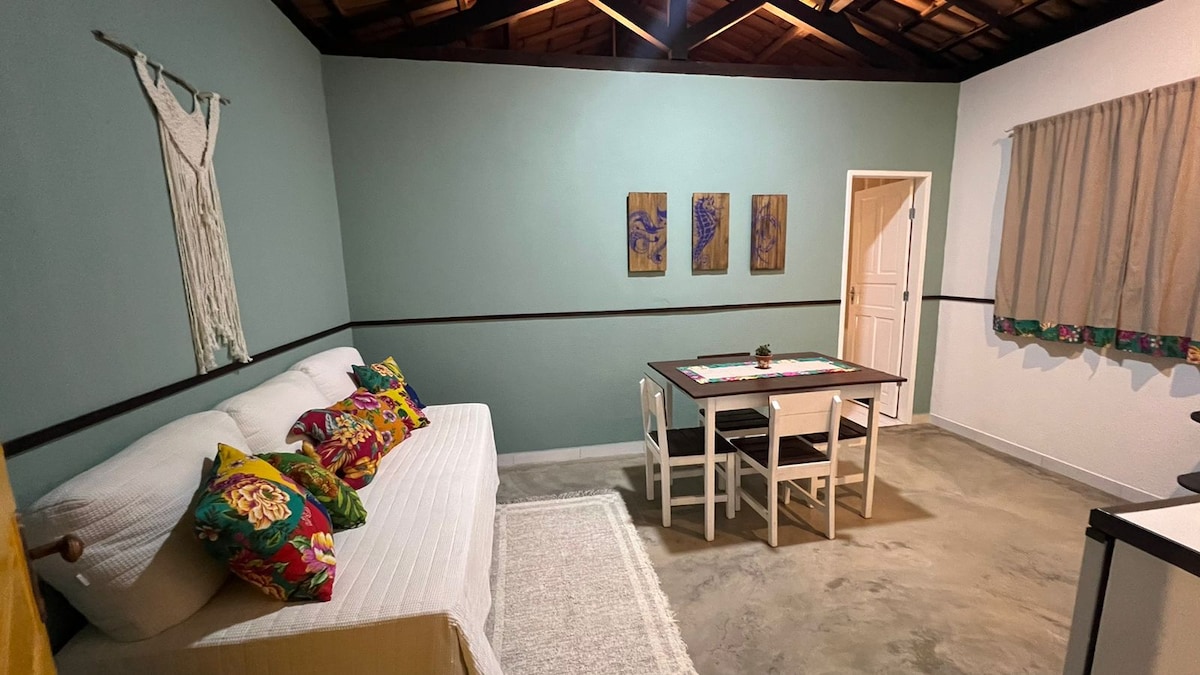 Oplev charmen ved vores Colibri Chalé i Cumuruxatiba, perfekt til op til fem personer. Nyd en hyggelig suite med dobbeltseng, enkeltseng og aircondition. Stuen, der er udstyret med en dobbeltseng, forbinder til et lille køkken komplet med redskaber, ovn og elkomfur med to kogeplader. Mærk havbrisen og brisen på den dejlige udendørs balkon. Beliggende 100 meter fra havet og centrum af Cumuru, kan du udforske alt til fods.