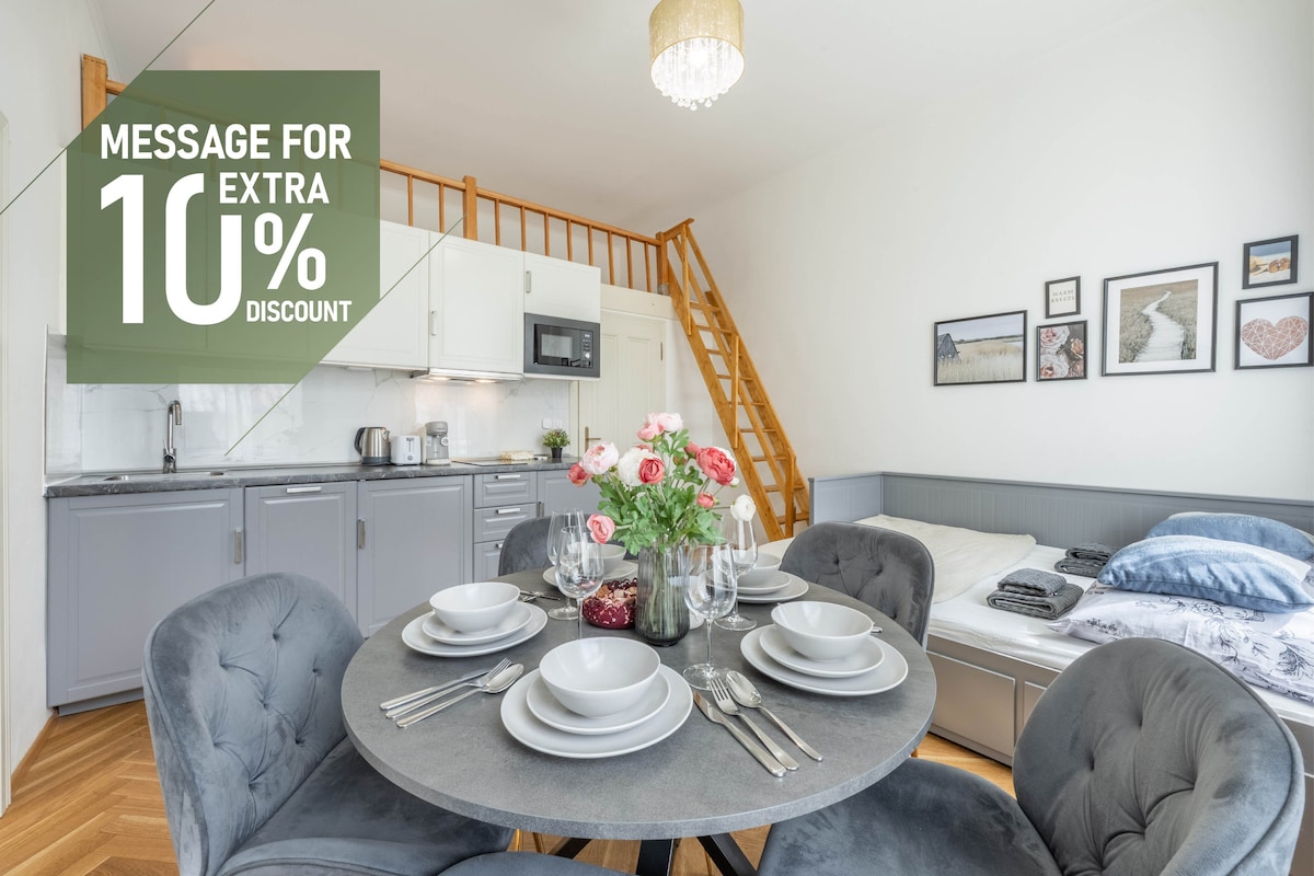 Velkommen til NAPZ-BOLIGER vores charmerende lejlighed, kun 20 sekunder væk fra den majestætiske Karlsbro! Den smagfuldt designede studiolejlighed på ca. 30 m2 har plads til op til tre gæster. Vores hjem ligger på tredje sal i en historisk bygning fra det 18. århundrede og giver dig et unikt indblik i svundenes pragt, kombineret med moderne komfort. Kun det antal senge, der svarer til de bookede personer, vil blive gjort klar.