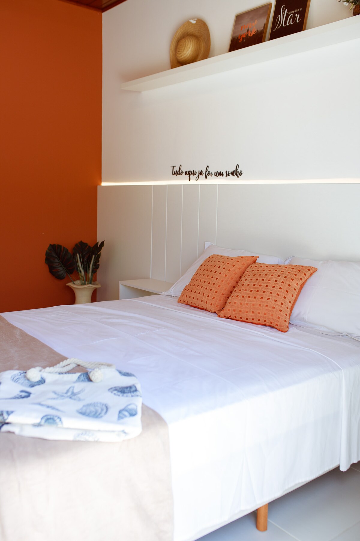 Quarto 2: Inclui uma cama box casal, frigobar, ar condicionado e uma smart TV de 42” com acesso livre ao Netflix. O banheiro privativo dispõe de chuveiro a gás, secador de cabelos, além de toalhas de banho, rosto e piso.