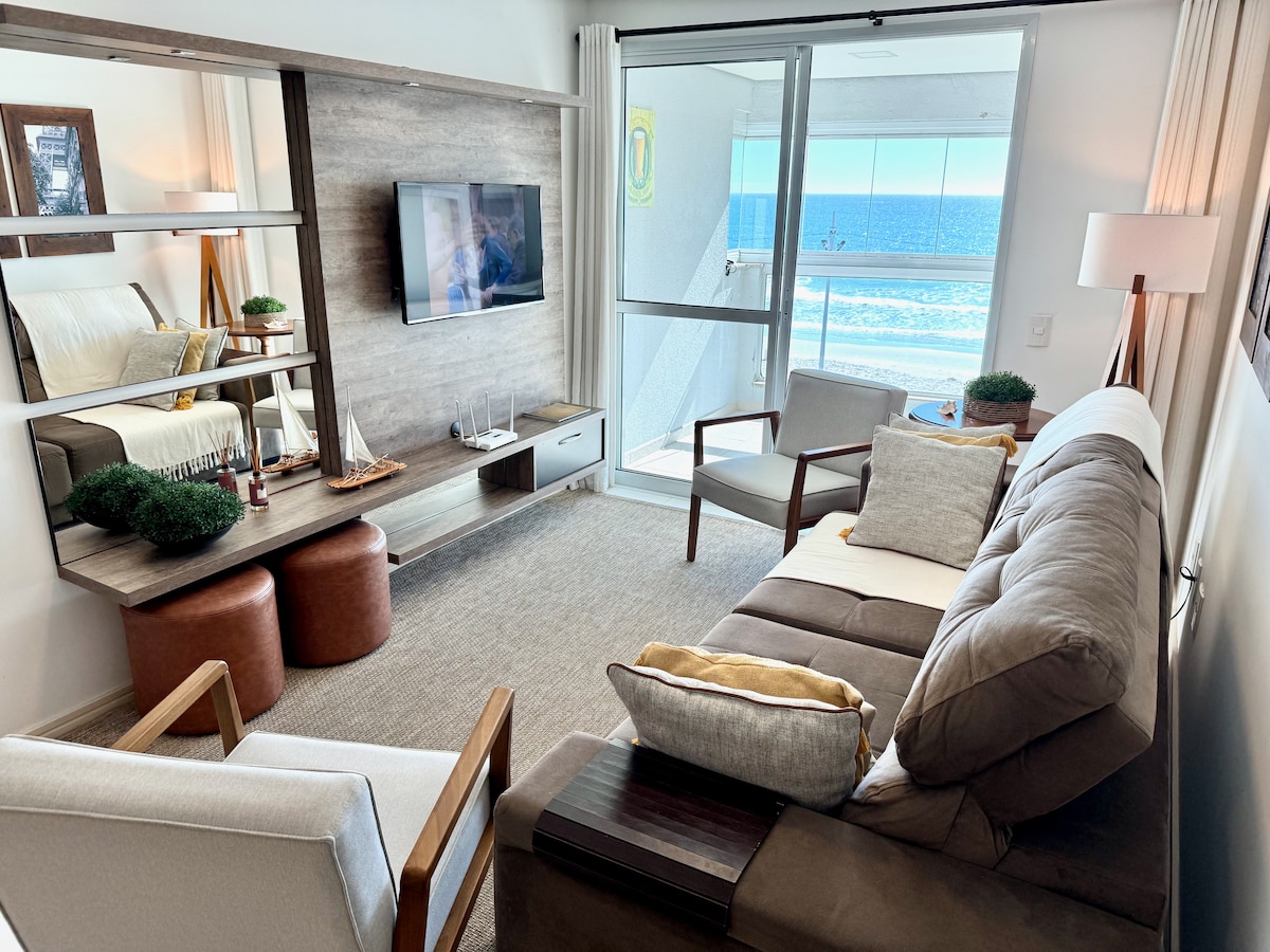 Bo ved den smukke havstrand i Jurerê (Florianópolis, SC) i en moderne loftslejlighed med amerikansk køkken, dobbeltseng, split aircondition, 40" LED SmartTV med kabel-tv, YouTube og Netflix, minibar, komfur, mikrobølgeovn, varmt bad og stor balkon med sideudsigt over havet.