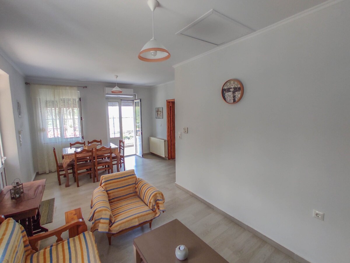Keep it simple at this peaceful and centrally-located place. Your family will be close to everything when you stay at this centrally-located place. You will find close to our house supermarket, bakery, farmacy, restaurants and bars all reachable by walking.The beach is less than 80m far, very nice and clean, organized with sunbeds. The house it’s renovated in 2024 and everything it’s brand new.We have yard with natural shadow.The village is 4 km far from Prínos Port