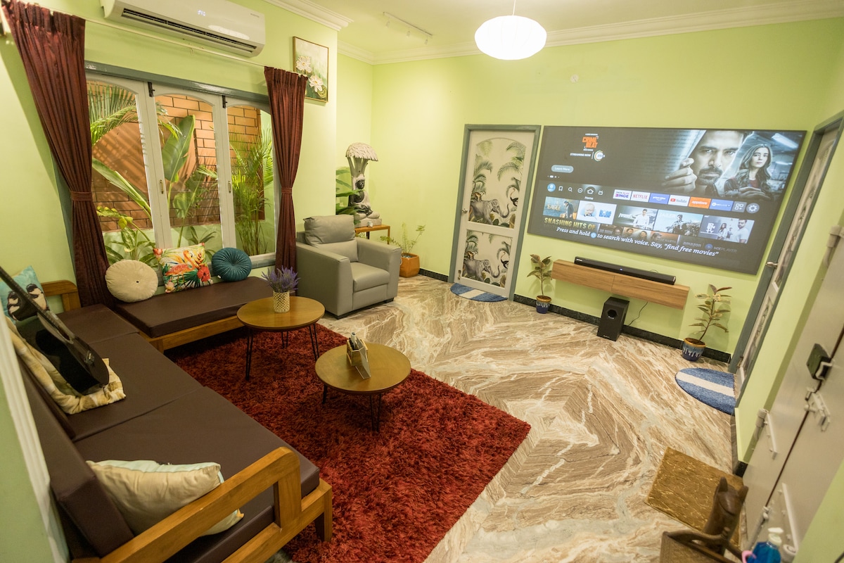 La Plage er et ultraluksuriøst ophold kun 100 meter (3 minutter til fods) fra Pondicherry Beach og ved siden af White Town🏖️. Nyd en afslappende privat jacuzzi til 🛁 2 personer, en lysende onyxbar🧱, 🎬 120" projektor med Dolby-lyd, 🌐 1000 Mbps WiFi og 18 OTT-apps som Netflix📺. Slap af i den 🌿 fredfyldte baghave – børnevenlig og fredfyldt. Kun 8 minutter (550 m) fra Sri Aurobindo Ashram🕉️. Perfekt til romantiske udflugter, strandelskere og filmaftener. Din Pondy-ferie venter. Skjult perle i hjertet af Pondy