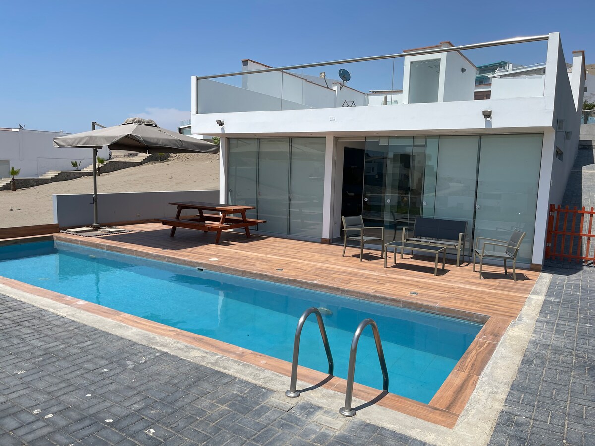 🌊 Smukt hus på første række ved havet med direkte adgang til stranden og en spektakulær udsigt. Ideel til ferier som par, familie eller med venner. Har fem soveværelser, fire komplette badeværelser, privat pool, grillområde, lerovn og Starlink-internet. Fremragende beliggenhed: 5 minutter fra Cerro Azul-piren og restauranter (gå på sandet i 20 minutter), 15 minutter fra Asien og 1 time fra Lunahuaná. Rummelige og perfekte rum til hvile og sameksistens.