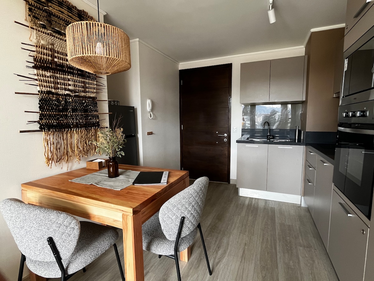 Ny lejlighed med parkering, en flot udsigt over Puerto Natales havnefront, havet ved Última Esperanza-bugten og dens vidunderlige bjerge. Det er et perfekt sted at hvile før eller efter dit besøg i Parque Torres del Paine . Lejligheden har 2 soveværelser, 2 badeværelser, et fuldt udstyret køkken og en terrasse. Du vil kunne få adgang til opvarmet pool, betalt tøjvask og andre fællesområder. På få minutters gang kommer du til forskellige restauranter og butikker