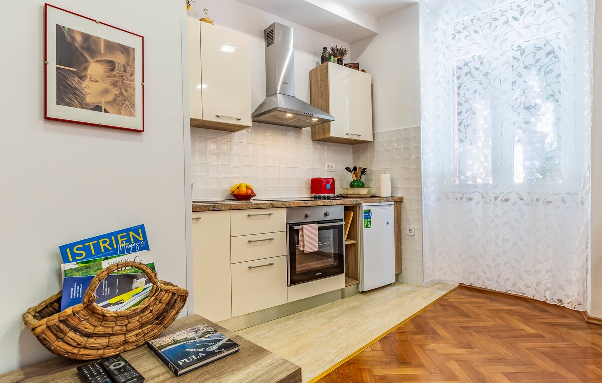 Nyd den elegante indretning af lejligheden i selve centrum af byen. Lejligheden er ideel til 2 personer og består af en stue, køkken og spisestue, soveværelse, badeværelse og en lille lukket terrasse. Den ligger på første sal på en af de mest berømte gader i Pula – Kandlerova Street. Udstyret til en ideel ferie og til at nyde din velfortjente ferie.
