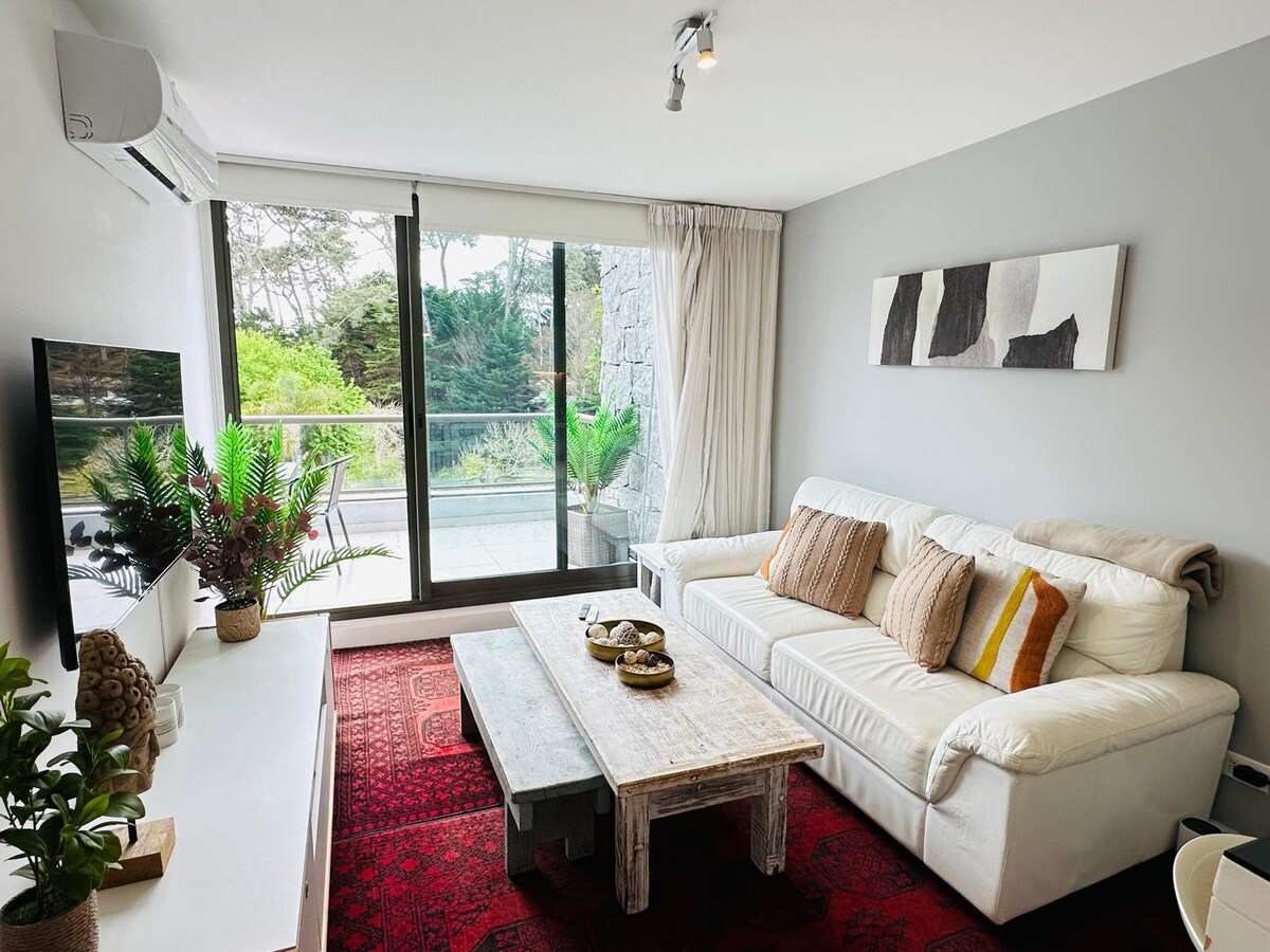 Slap af i denne rolige og elegante bolig. Nyd en unik udsigt over Punta del Este. Den har et (åbent) soveværelse, et badeværelse, udstyret køkken, aircondition, WiFi, smart-tv osv. en 2-personers seng og 2 enkelmadraser. De bedste tjenester; herunder indendørs og udendørs swimmingpool, grill, garage, mikrobiograf, fitnessrum, udendørs lege for børn, værelser (børn, teenagere og voksne) Spørg mig.