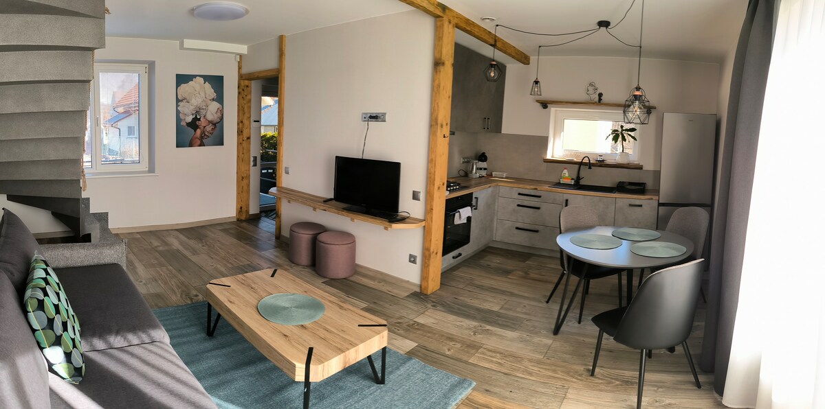 En meget hyggelig, unik og eksklusiv designloftssuite med egen terrasse og panoramaudsigt over naturen. 600 m til havet, dette er det perfekte sted for par, familier, der leder efter privatliv og forbindelse med naturen. Det er et sted, hvor byens puls blander sig med fred og giver gæsterne en enestående følelse af afslapning. De store panoramavinduer giver dig mulighed for at beundre naturen, selv når du er hjemme, på terrassen er det dejligt at slappe af, nyde roen og den rene havluft.