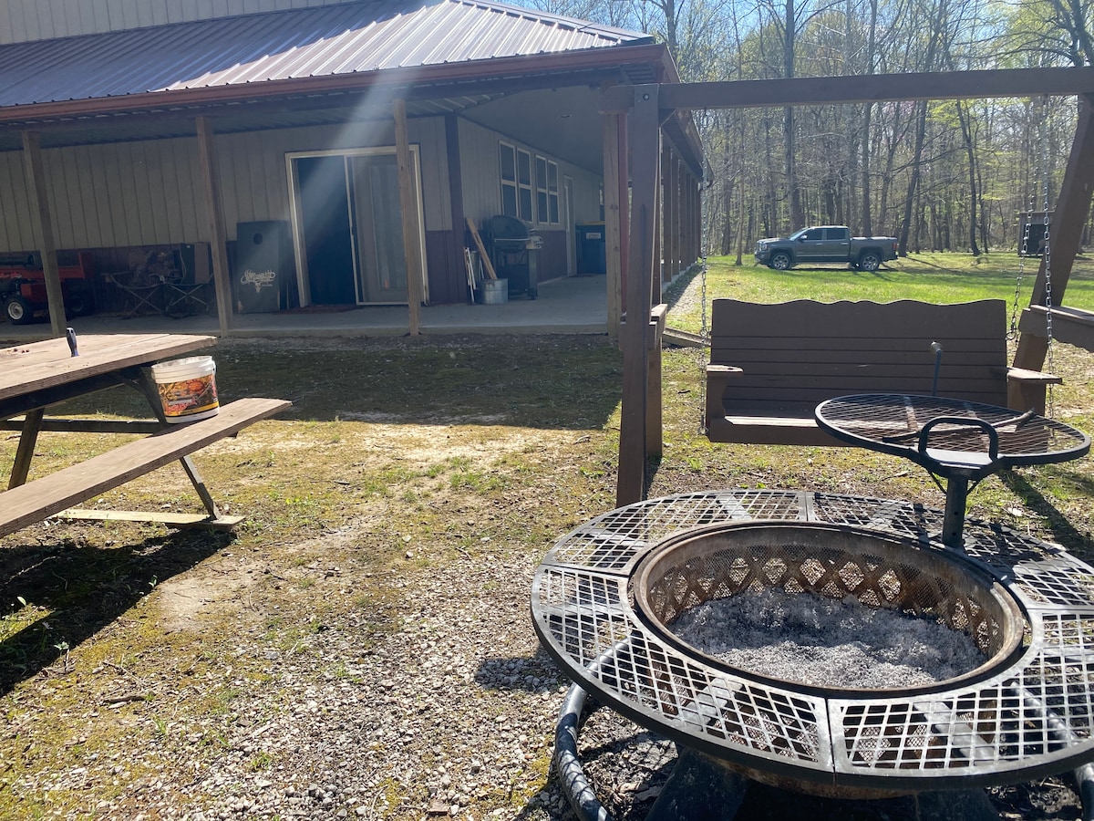 Fredeligt landsted i nærheden af 3 Fat Labs og Depauw University. Beliggende på en smuk og rolig 1 hektar stor grund med bålplads. Slap af på terrassen bagved og nyd udsigten, besøg Oakalla overdækkede bro eller vandre på de nærliggende Depauw naturstier. Boligen har en suite master med kingsize-seng og åbent plan. Børneværelse med køjeseng, legetøj og pak og leg. Badekar i 2. badeværelse. Nyd godt af et stort udvalg af dvd'er og spil til børn og voksne. Satellit-tv og internet. Vaskemaskine/tørretumbler. Kun 3,5 miles til Depauw.
