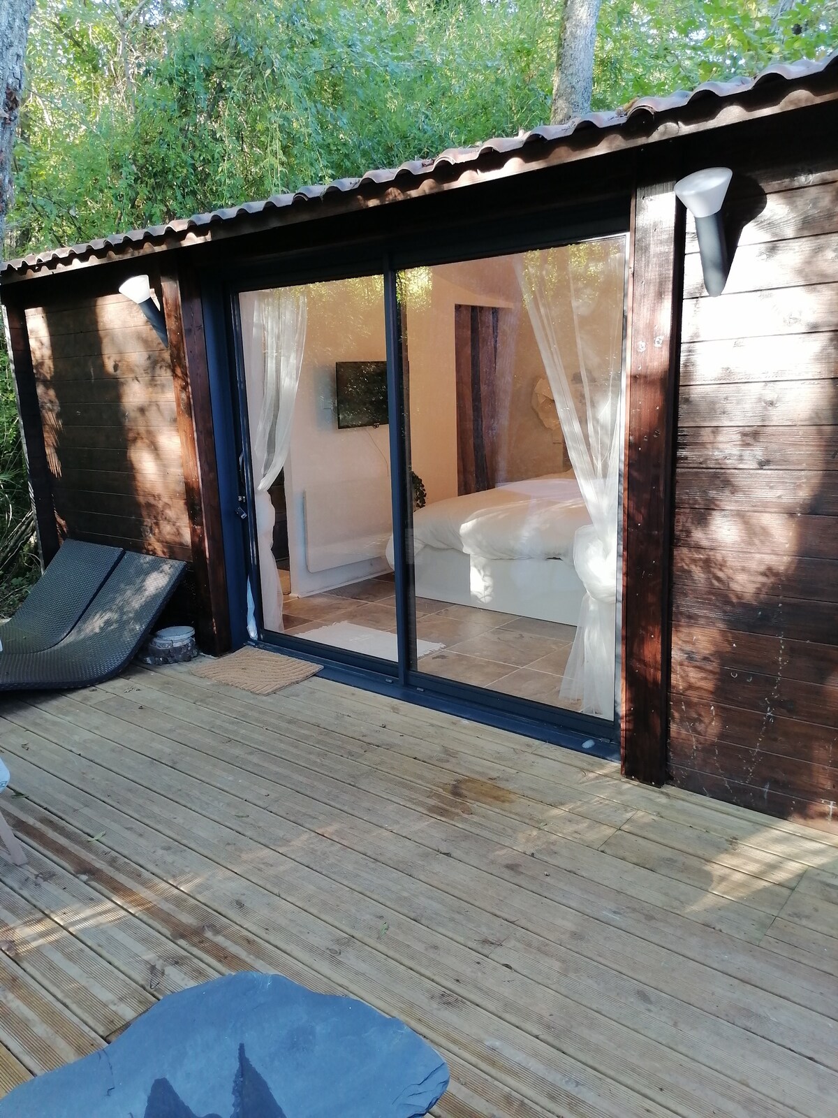Beliggende i min boligs have, har du adgang gennem haven til dette smukke hus, 19 m2, i grønne omgivelser, med en privat møbleret terrasse, solrig og i fuldstændig privatliv. Det er kun et værelse, det er lille, hyggeligt, komfortabelt og funktionelt, alt er der! Murphy-seng, badeværelse med brusekabine og toilet. Vendbar aircondition. Rullende skodder på alle vinduer. I køleskabet og skabene finder du morgenmad og basisprodukter