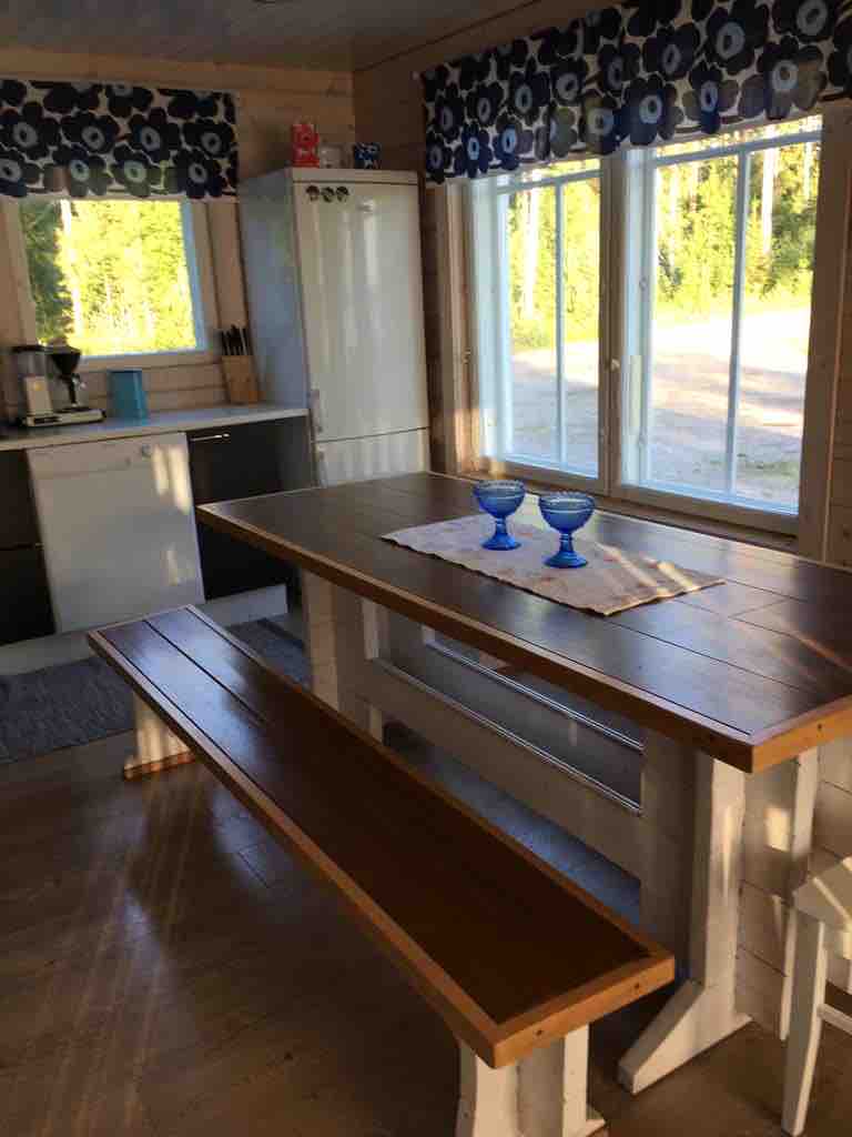 Nu er der et drømmeobjekt til rådighed for den ensomme fisker. Det er ikke blevet ødelagt af moderne bekvemmeligheder, udover at der er strøm til køleskabet. Og telefonen kan oplades, hvis det er nødvendigt. Når det bliver mørkt om efteråret, kan man måske tage en elektrisk lygte med... Der er et udendørs toilet, og drikkevand kan hentes hos naboen. Varmen leveres af en porinmatti, og du kan hente vand til saunaen med en spand fra søen. Det er også muligt at skifte den kugleformede grill ud med en gasgrill. Tilføjelse. Kaffekedel og mikroovn kan tilføjes til udstyret.😉